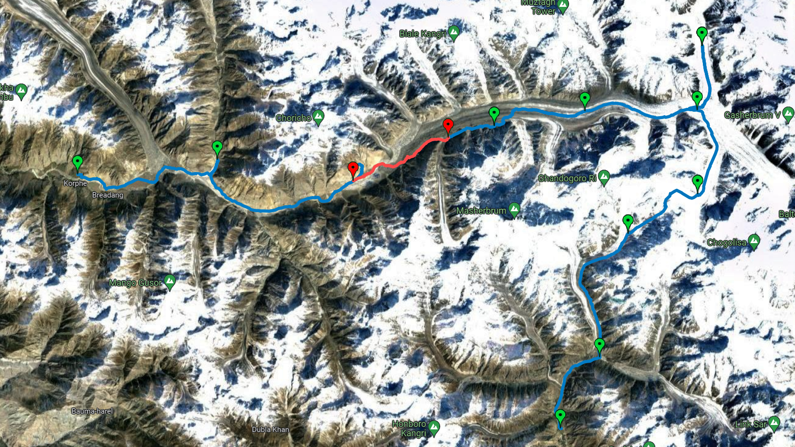 De tong van de machtige Baltoro gletsjer komt in zicht.