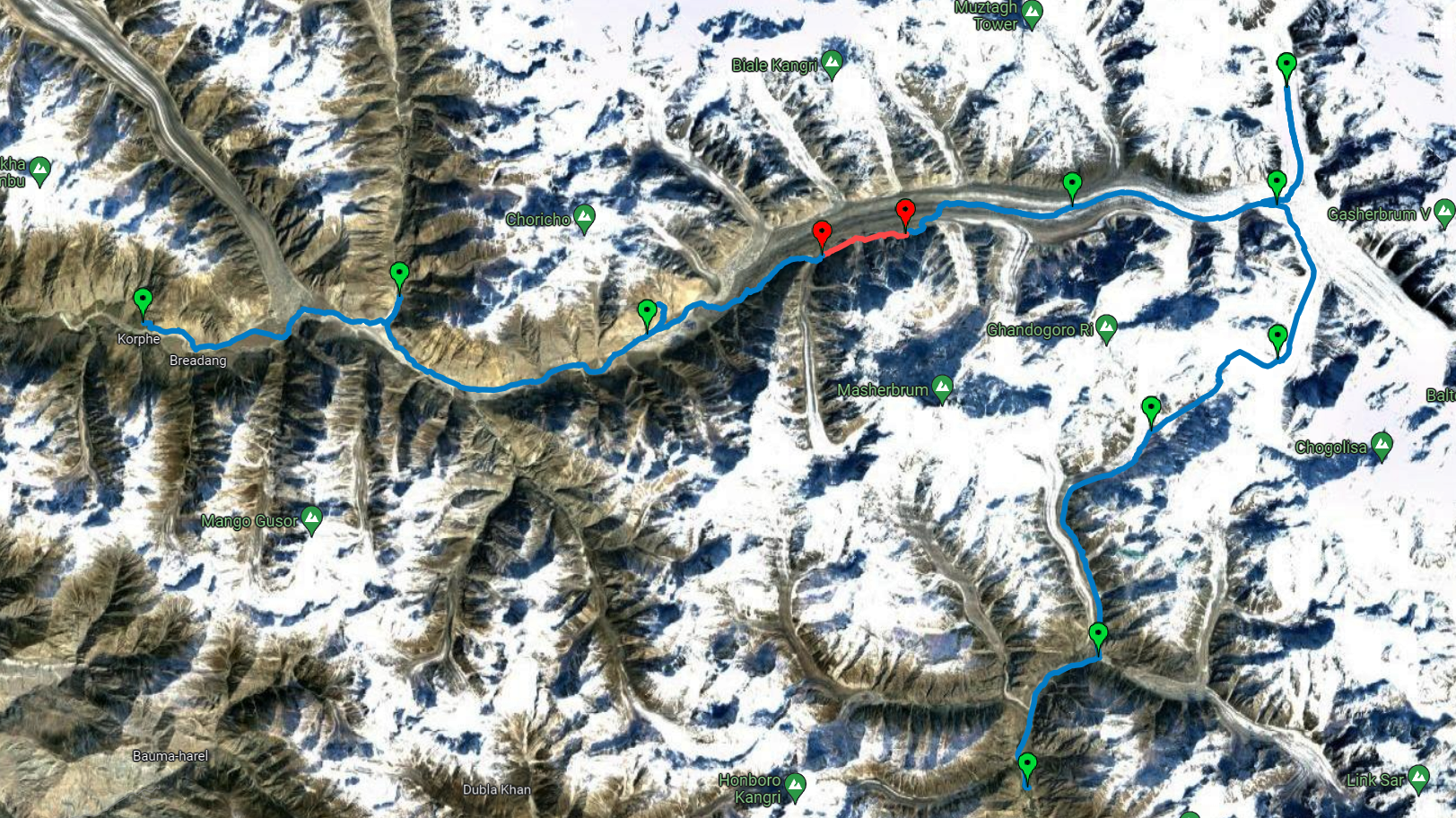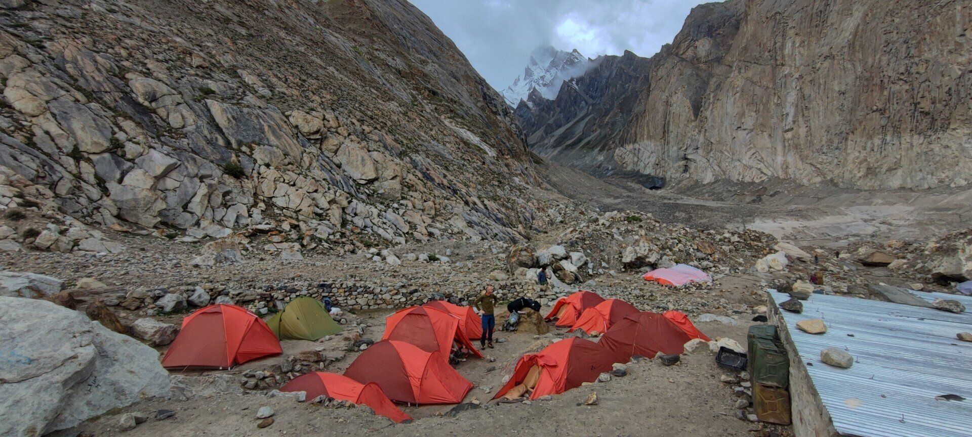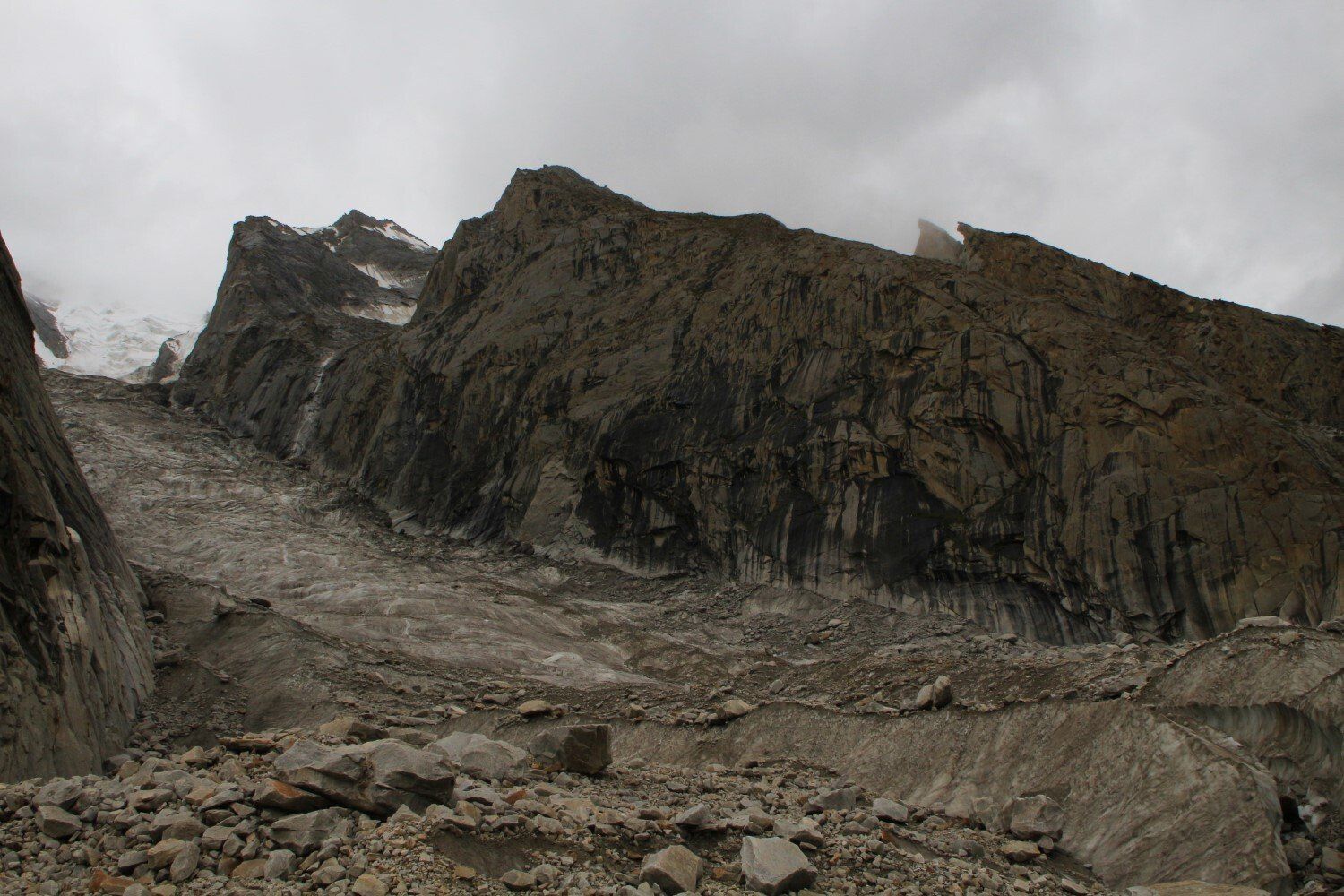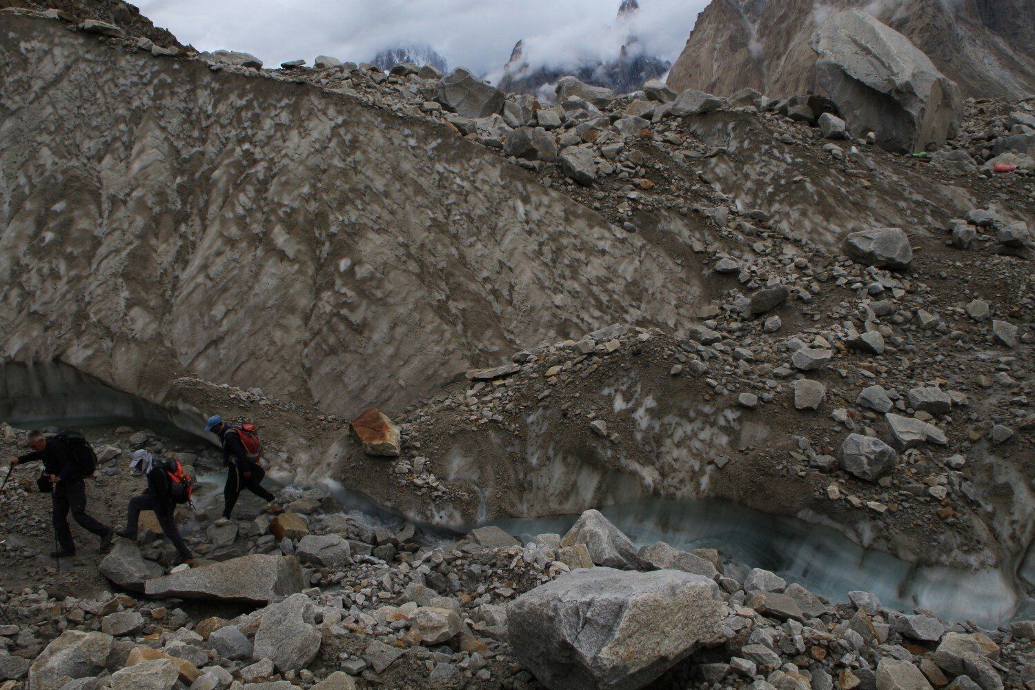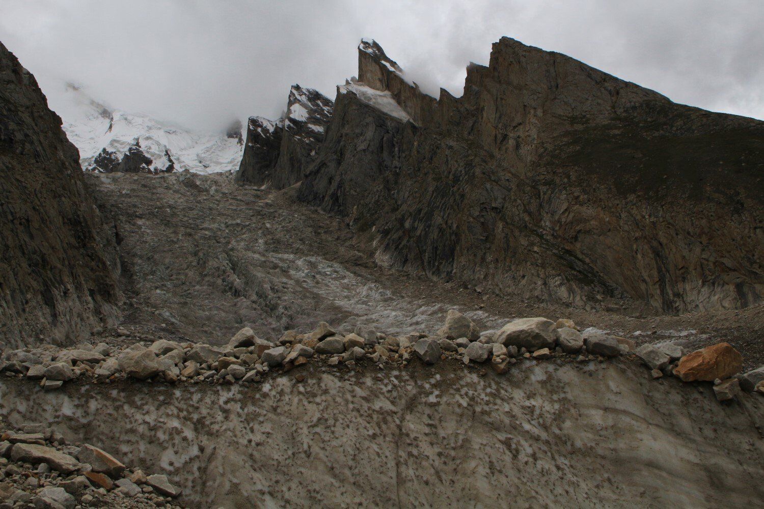 Het is nog steeds bewolkt als we in de ochtend de tent uitstappen. Alleen de lagere lagere pieken zijn tussen de wolken zichtbaar. We hebben vandaag een korte tocht naar Urdukas. We lopen langs de rand van gletsjer en af en toe erop, als we een zij-gletsjer moeten oversteken. Ik blijf mij verbazen van de grote en het aantal rotsblokken die op de gletsjer liggen. Bij de eerste break hebben een mooi uitzicht op twee spitse bergen. Weer onderweg hebben we het geluk een "pika" goed voor onze lens te krijgen, dit zijn kleine (fluit)hazen met muizenoortjes. Ik volg de muilezels over een stuwwal om daarna weer over een stroompje te springen op de gletsjer. Soms is het even zoeken naar het juiste pad. We passeren een grote zij-gletsjer, gletsjer-spleten, grote meren en kleine plasjes. Nog een laatste klimmetje naar Urdukas, dat hoog naast de gletsjer ligt op terrassen die oorspronkelijk uit de helling zijn gehakt door de K2-expeditie van de hertog van Abruzzen in 1909. Precies op tijd want het begint te regenen. We lunchen in het kamp. Het is een heel smerig kamp, door de regen is het modderig en overal ligt paardenstront. De wc's liggen ver voorbij het kamp en je moet oppassen dat je niet uitglijdt. Met mijn diarree zijn deze wc's geen optie, dus toch maar in de vrije natuur.