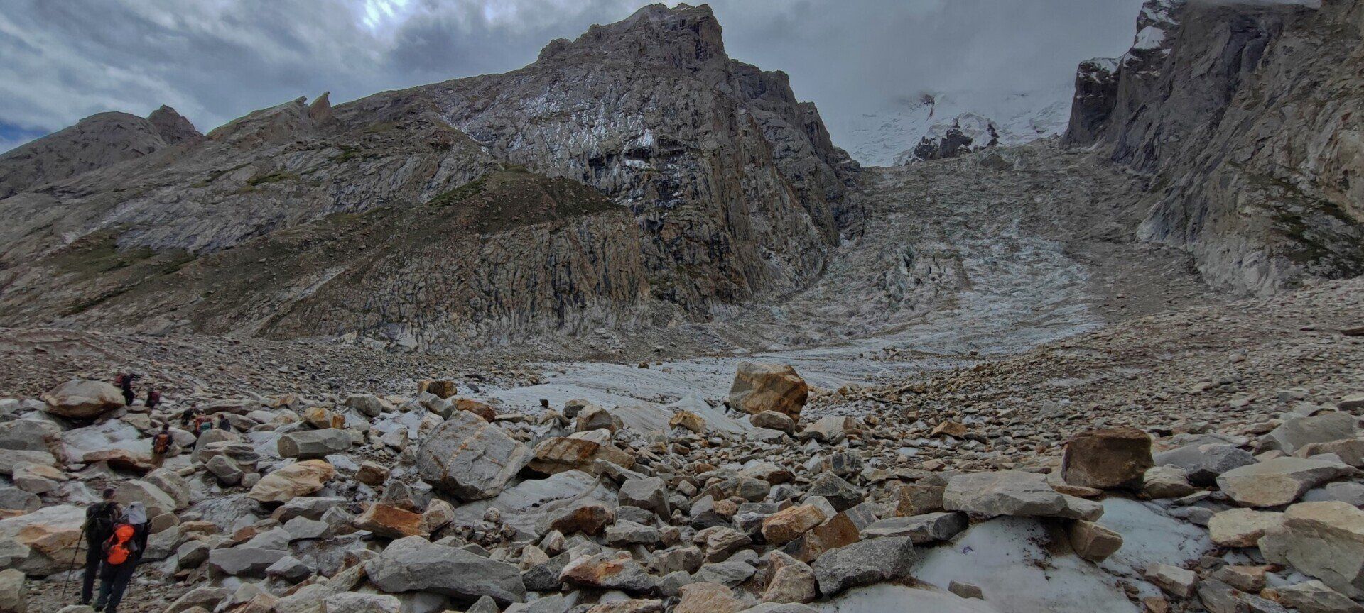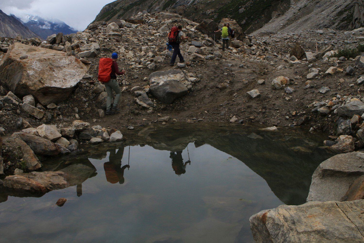 We lopen langs de rand van gletsjer en af en toe erop, als we een zij-gletsjer moeten oversteken.