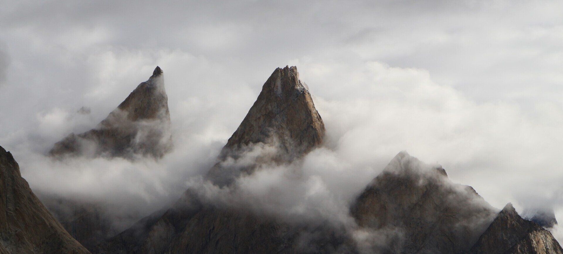 Alleen de lagere lagere pieken zijn tussen de wolken zichtbaar.