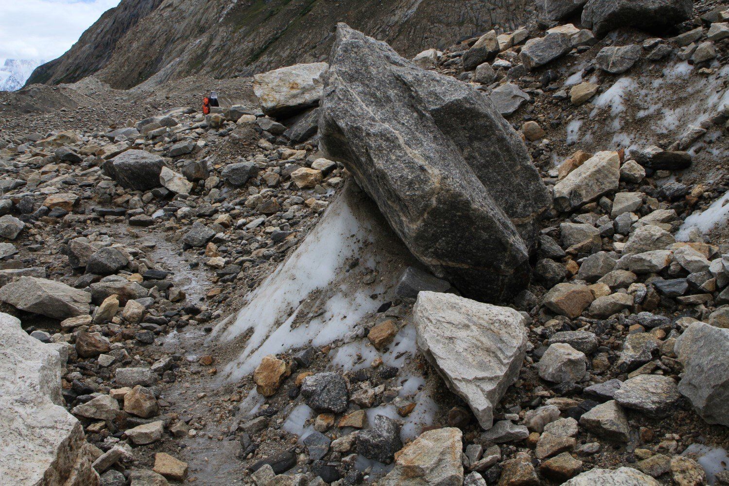 Ik blijf mij verbazen van de grote en het aantal rotsblokken die op de gletsjer liggen.