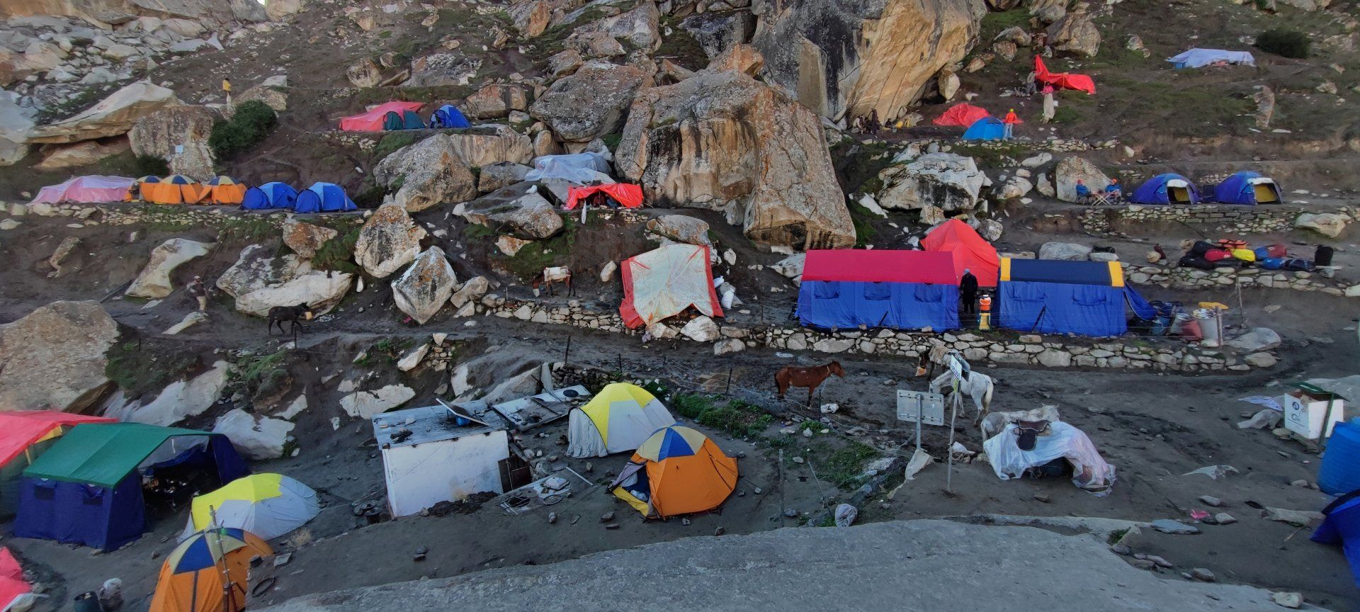 Bij het camp van Goro I lunchen we. Na de lunch film ik hoe de keukenploeg hun spullen op hun rug nemen en vertrekken, terwijl wij nog even van het zonnetje blijven genieten. Ik heb diep respect voor ze. Na de lunch lopen we tussen de witte ijspiramides verder. In de verte zien we Goro II al liggen en rond kwart voor 3 bereiken we al de kampplaats. Terwijl wij in de eettent van een kop warme thee genieten, komen de muilezels even de tent in koekeloeren. Een van de paardenmannen drijft de muilezels echter snel verder, zodat wij verder kunnen nagenieten van deze prachtige dag.