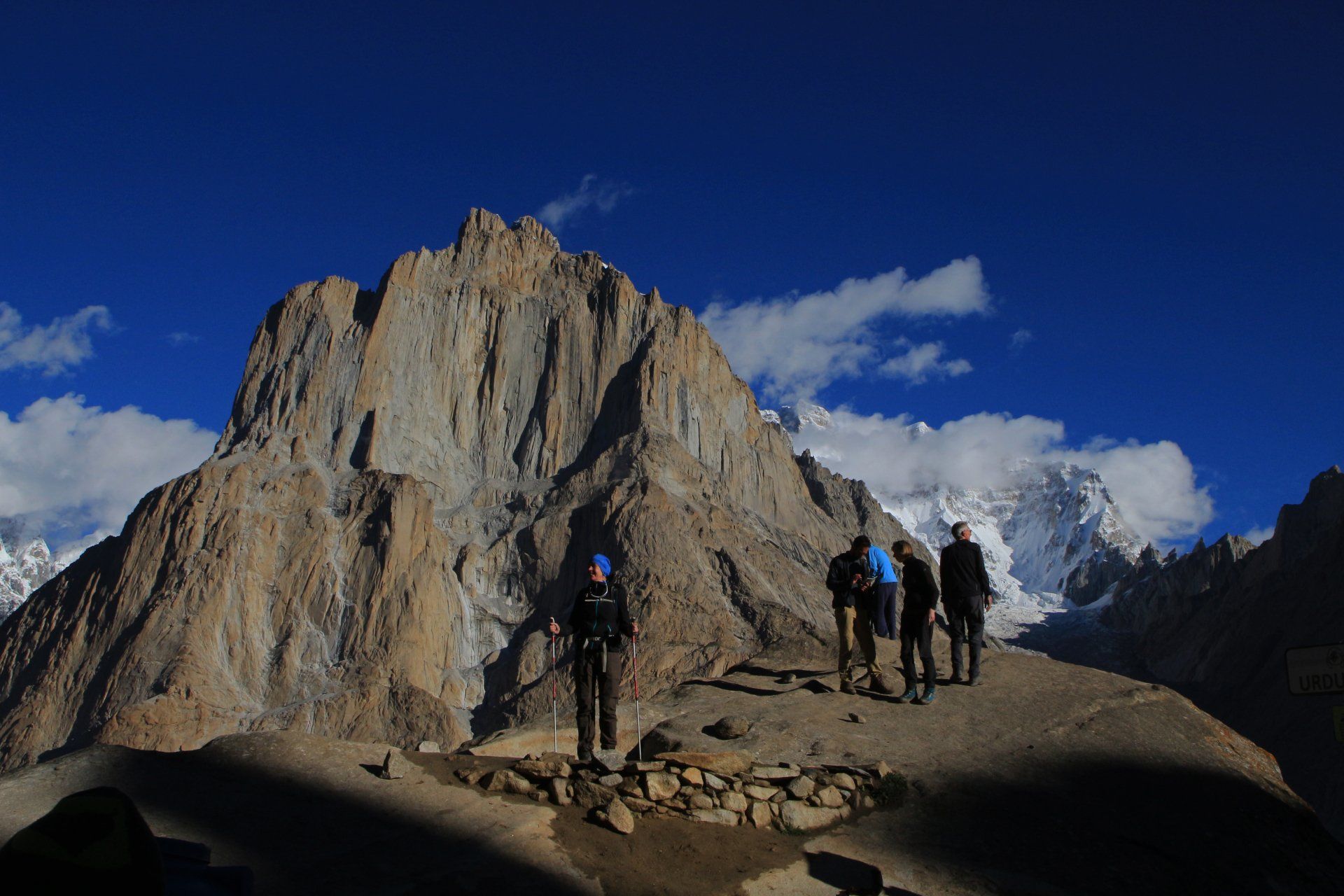 Verrast door een knal blauwe lucht stap ik uit mijn tent, de regen is verdwenen. De bergen rond ons vragen gewoon om gefotografeerd te worden, want we hebben werkelijk sensationele uitzichten op de Trango Towers en op de enorme rotswanden van Cathedral Peak en Lobsang recht tegenover ons, die als wallen boven de gletsjer uit steken. Het is echt genieten maar het ontbijt wacht en de tenten moeten afgebroken worden. Nog een keer poseren op de rots voor de Cathedral Peak en dan gaan we op pad.