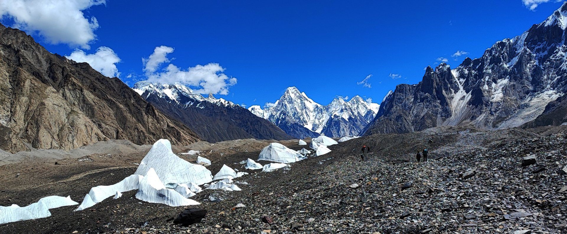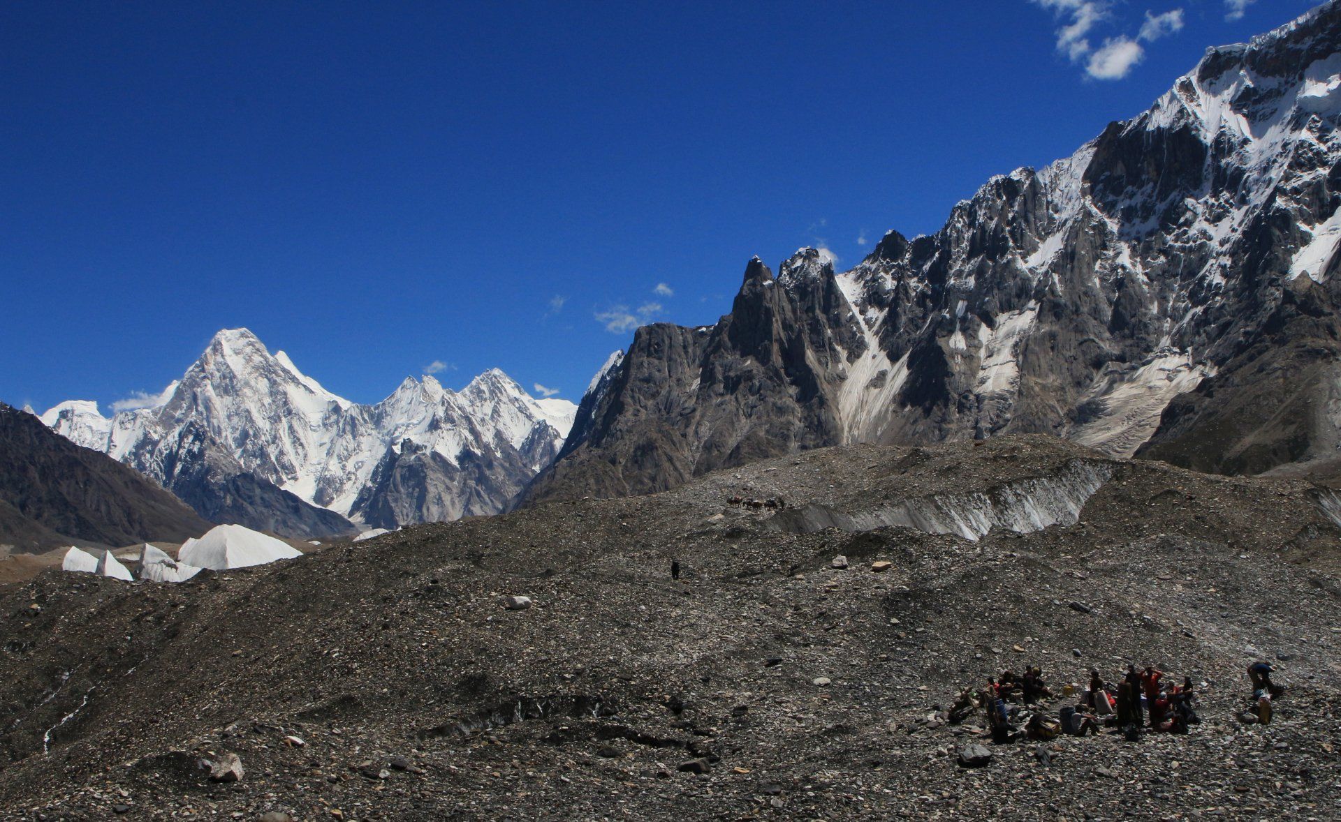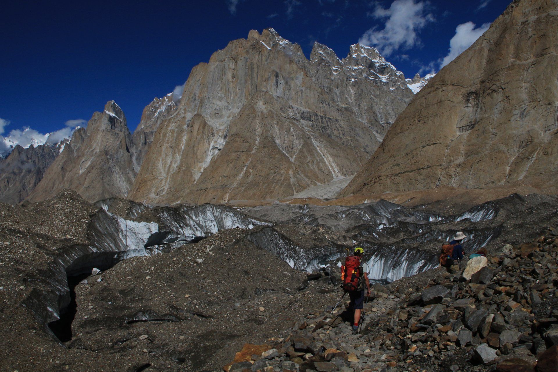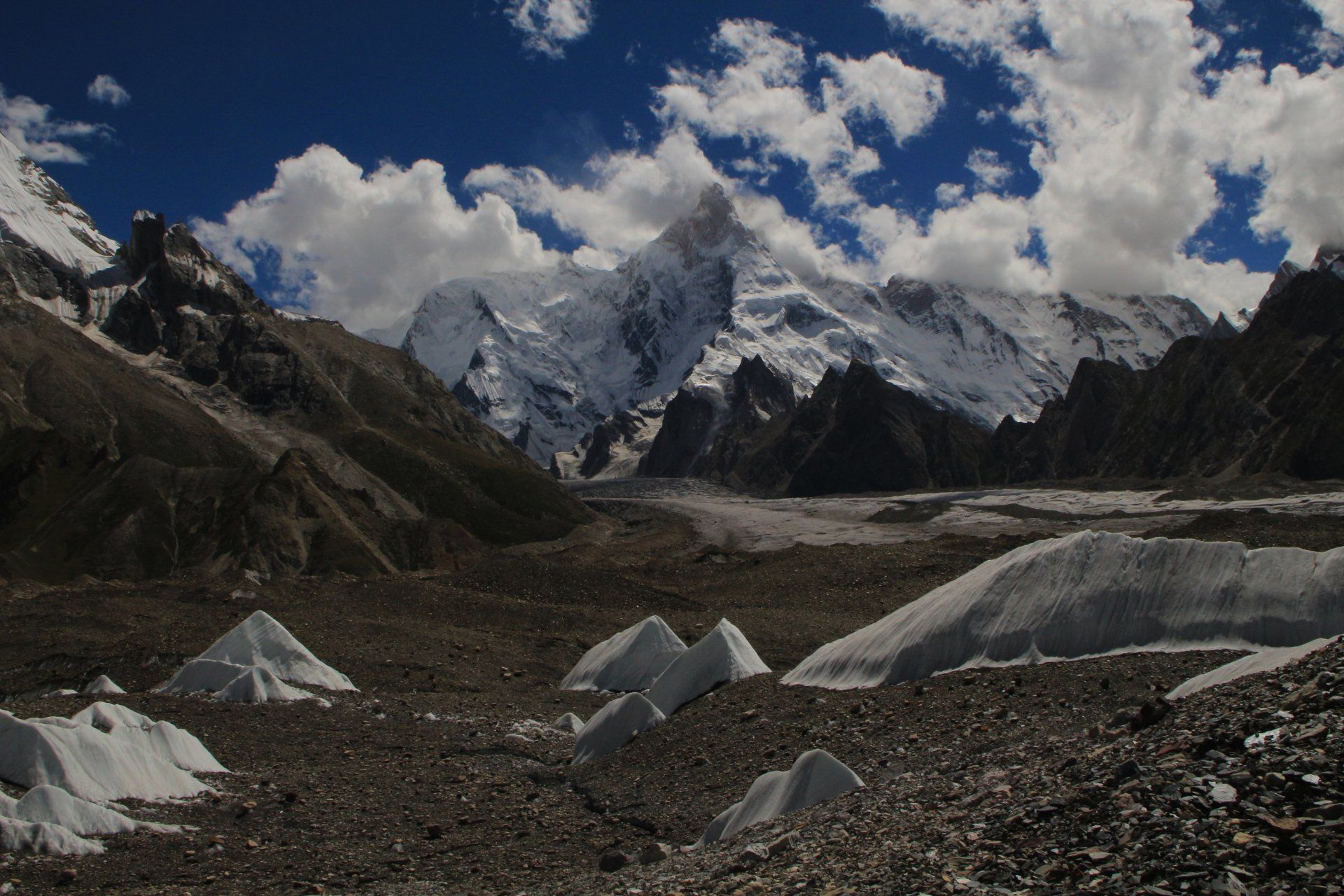 Het wordt een prachtige dag, ver weg hangt nog een wolkendeken boven een bergtop, we passeren een gletsjermeer en zigzaggen langs gletsjerspleten en springen over beekjes op de gletsjer. De zon schijnt volop, jammer dat we richting het zuiden lopen, waardoor mijn speciaal gekochte zonnecel op mijn rugzak te weinig zon krijgt. We steken dwars de gletsjer over in noordelijke richting en we zien naar het zuiden de Masherbrum (7821 meter). Richting Goro II zien we de Gasherbrum IV (7929 meter) met ernaast en halfverscholen Gasherbrum I (Hidden Peak, 8068 meter). Rusten doen we op een grote steen, hoewel sommige stenen op omvallen staan. In de verte zien we witte ijsbergen, die als pukkels uit de zwarte gletsjer opdoemen. Hoe dichterbije we komen hoe imposanter de ijspiramides worden.