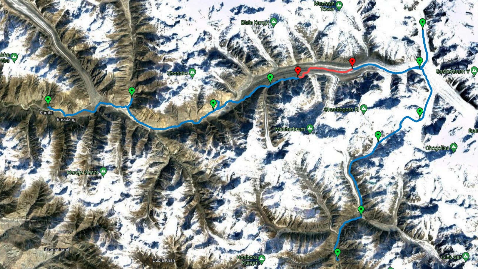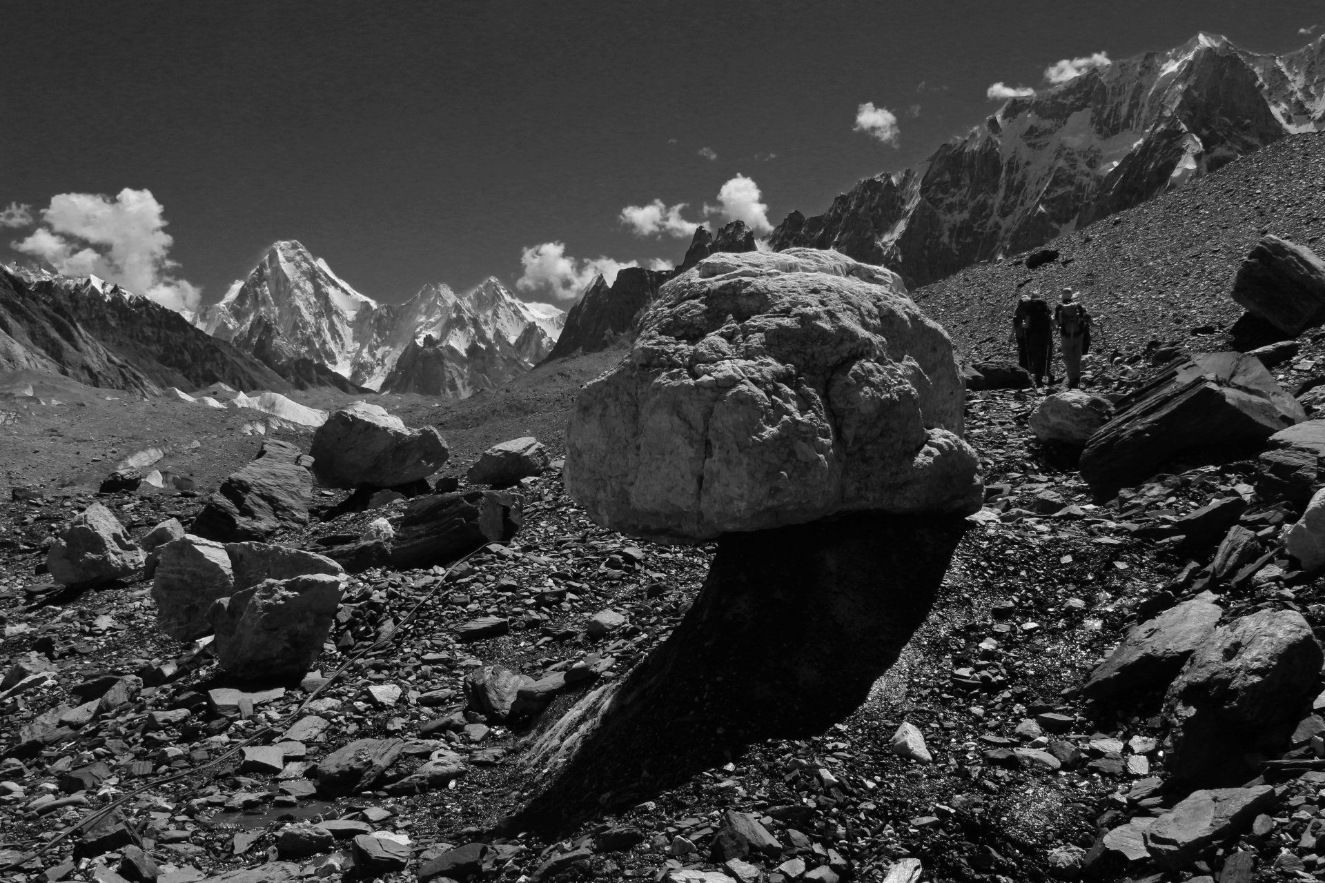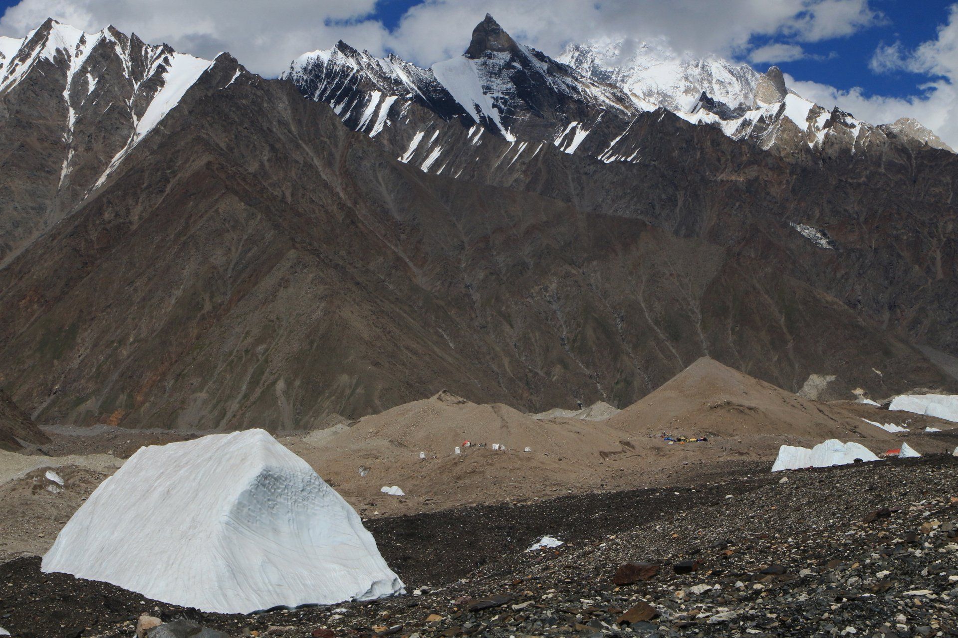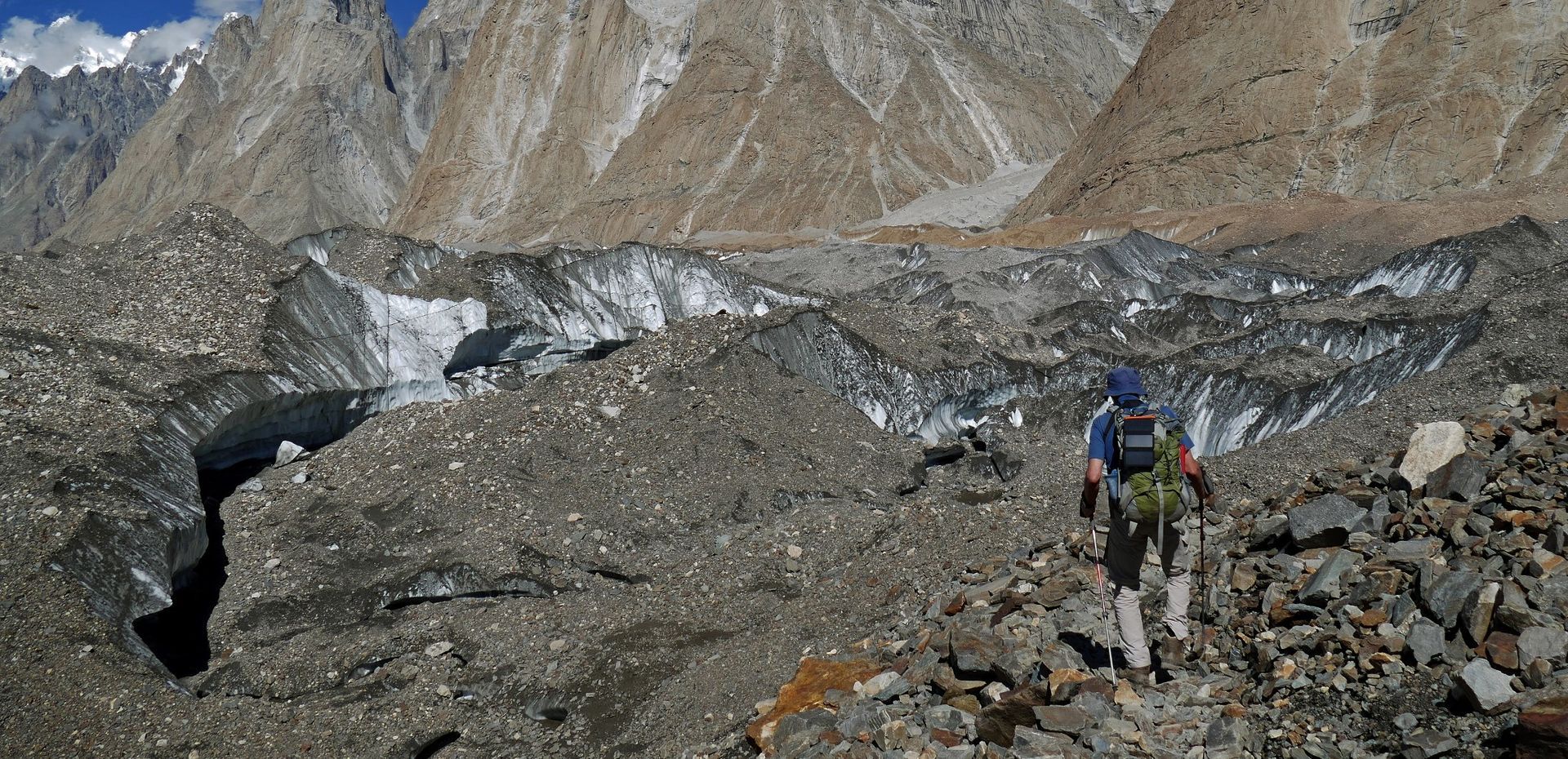 Het wordt een prachtige dag, ver weg hangt nog een wolkendeken boven een bergtop, we passeren een gletsjermeer en zigzaggen langs gletsjerspleten en springen over beekjes op de gletsjer. De zon schijnt volop, jammer dat we richting het zuiden lopen, waardoor mijn speciaal gekochte zonnecel op mijn rugzak te weinig zon krijgt. We steken dwars de gletsjer over in noordelijke richting en we zien naar het zuiden de Masherbrum (7821 meter). Richting Goro II zien we de Gasherbrum IV (7929 meter) met ernaast en halfverscholen Gasherbrum I (Hidden Peak, 8068 meter). Rusten doen we op een grote steen, hoewel sommige stenen op omvallen staan. In de verte zien we witte ijsbergen, die als pukkels uit de zwarte gletsjer opdoemen. Hoe dichterbije we komen hoe imposanter de ijspiramides worden.