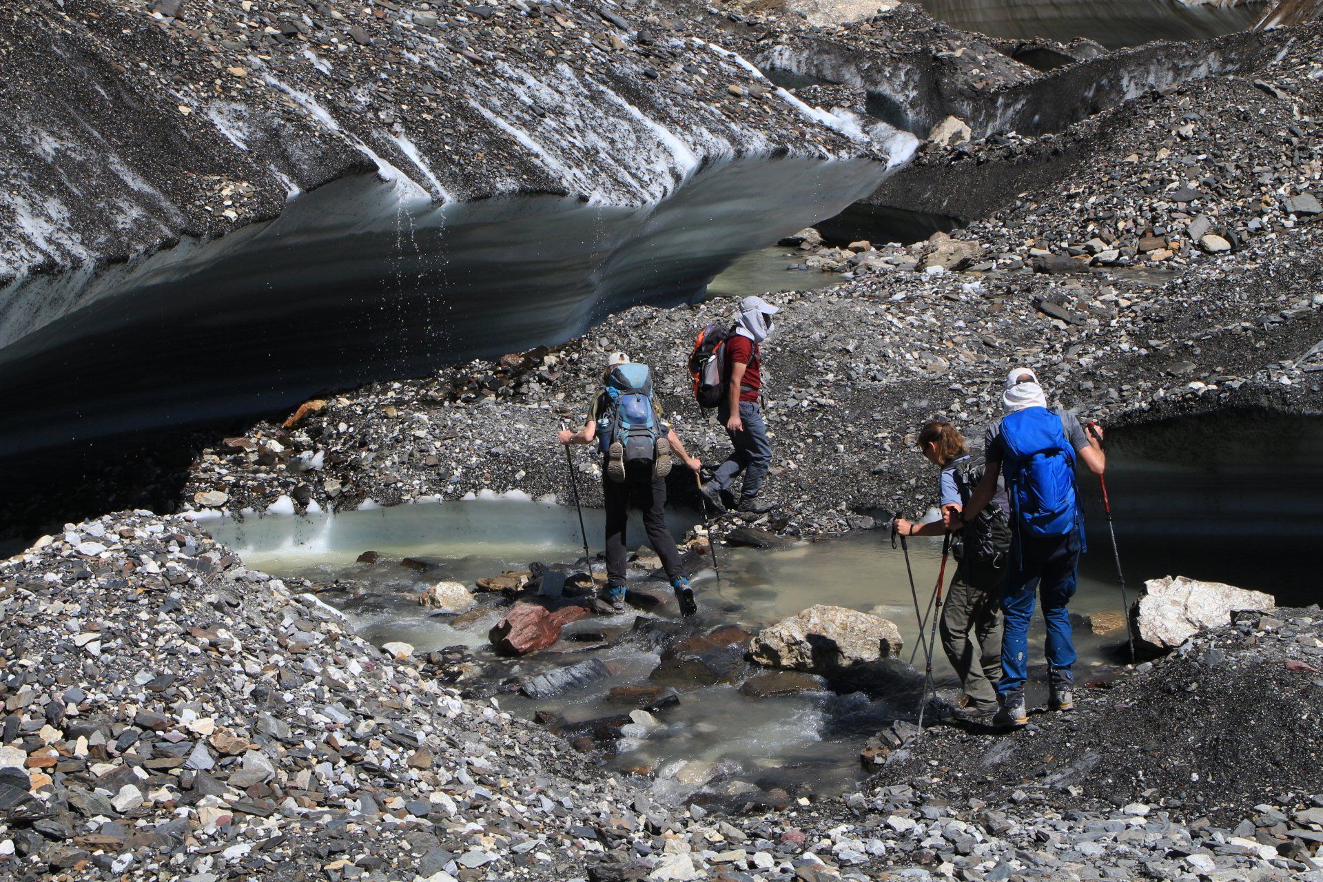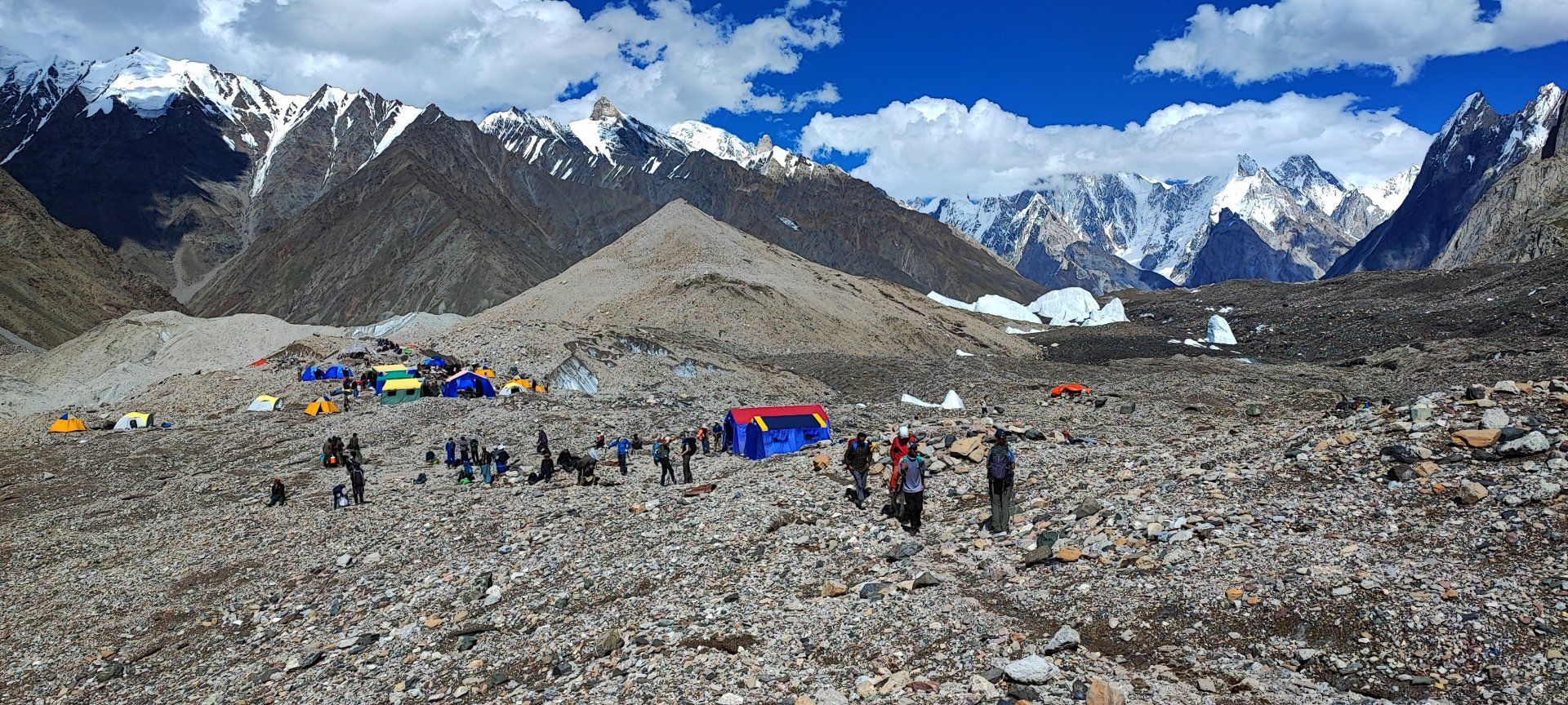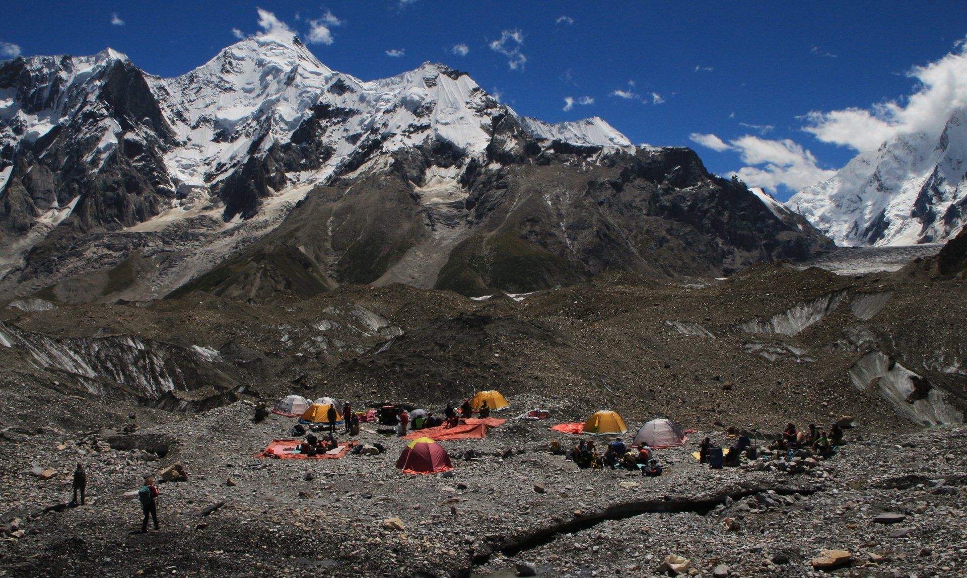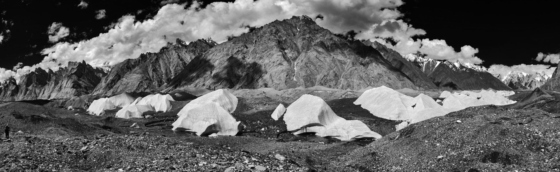 Het wordt een prachtige dag, ver weg hangt nog een wolkendeken boven een bergtop, we passeren een gletsjermeer en zigzaggen langs gletsjerspleten en springen over beekjes op de gletsjer. De zon schijnt volop, jammer dat we richting het zuiden lopen, waardoor mijn speciaal gekochte zonnecel op mijn rugzak te weinig zon krijgt. We steken dwars de gletsjer over in noordelijke richting en we zien naar het zuiden de Masherbrum (7821 meter). Richting Goro II zien we de Gasherbrum IV (7929 meter) met ernaast en halfverscholen Gasherbrum I (Hidden Peak, 8068 meter). Rusten doen we op een grote steen, hoewel sommige stenen op omvallen staan. In de verte zien we witte ijsbergen, die als pukkels uit de zwarte gletsjer opdoemen. Hoe dichterbije we komen hoe imposanter de ijspiramides worden.