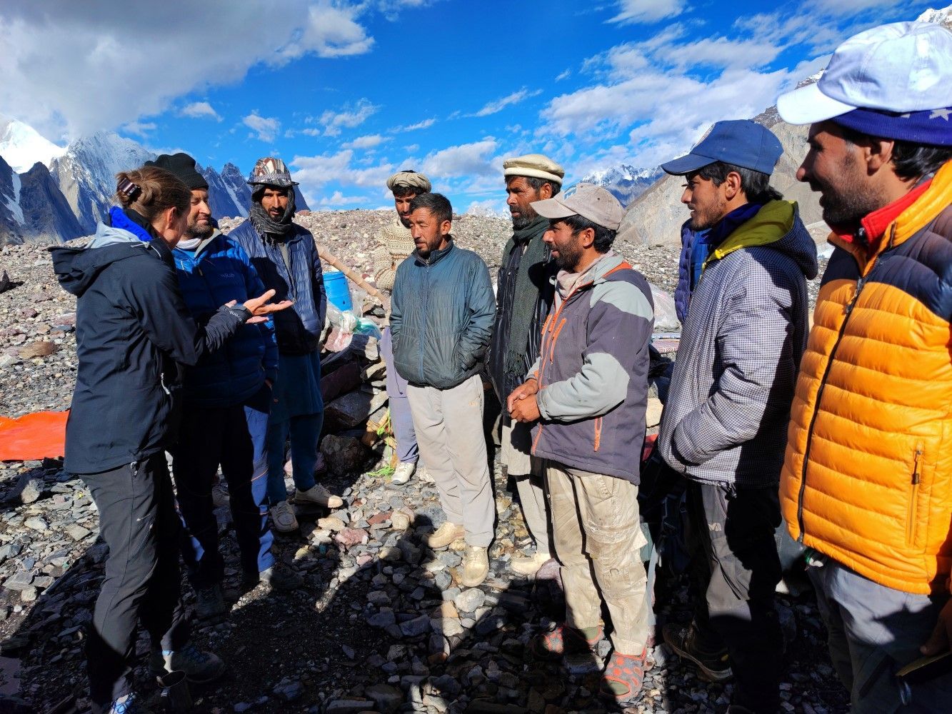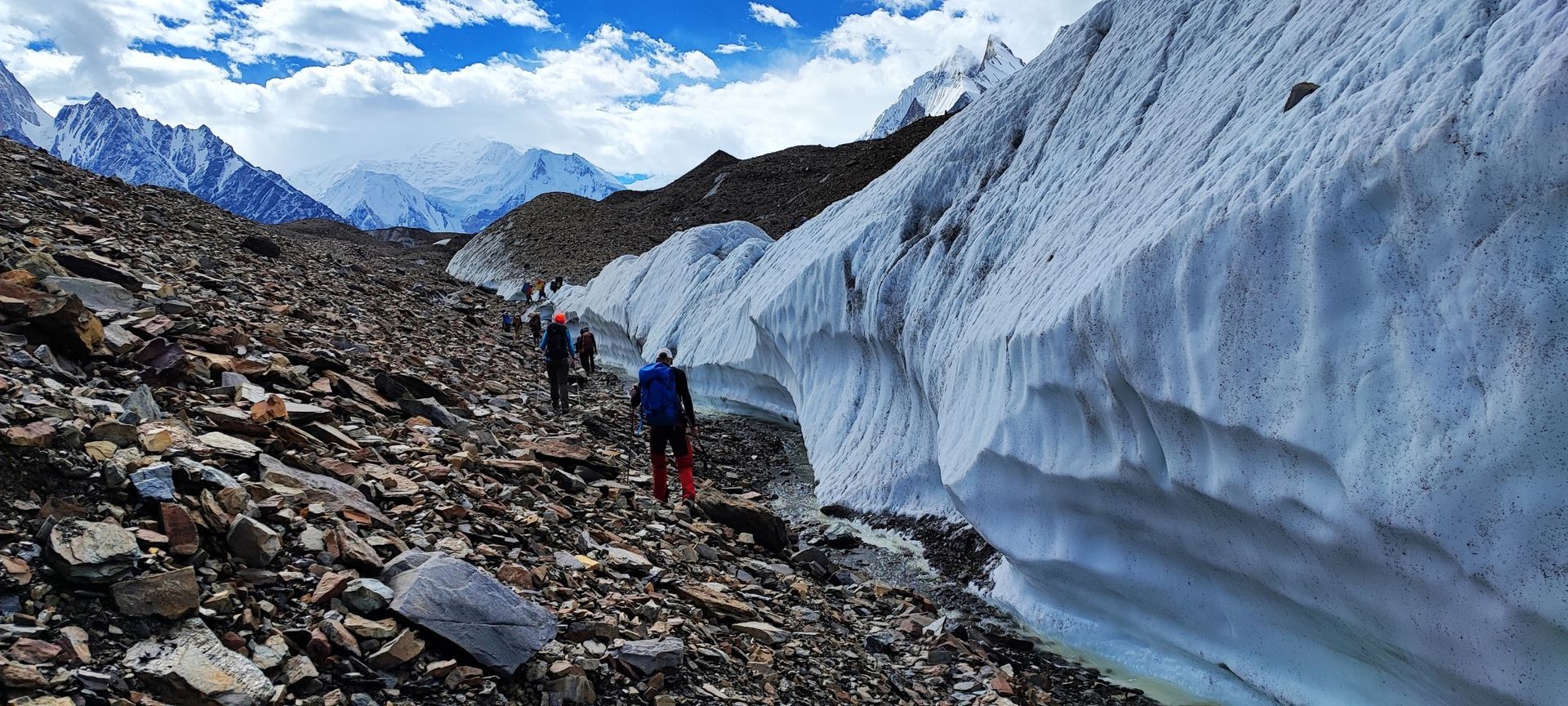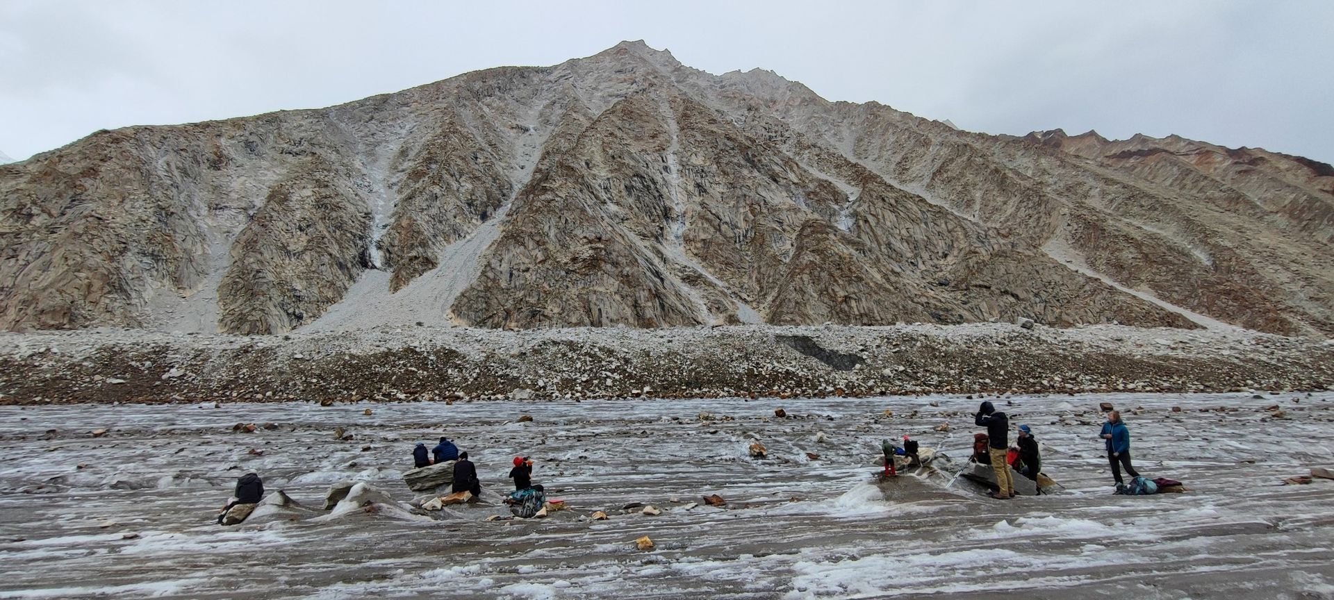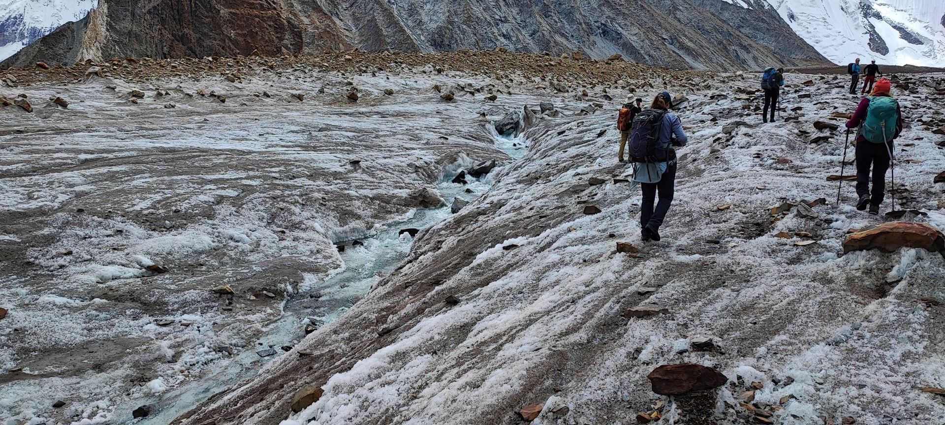 Het is een prachtige ochtend voor met een kop thee te genieten van de imposante bergen om ons heen, en een uur later is de K2 nog steeds te zien. Nadat Maaike de crew heeft toegesproken is het tijd om het kamp op te breken en te vertrekken naar Moonhill Camp ofwel Ali Camp. We volgen een veel minder bewandelde route langs de Upper Baltoro, een van de gletsjers die vanuit Chogolisa naar beneden komt en de enorme gletsjerknooppunten van Concordia voedt. Al na een klein uur lopen moeten we stuk afdalen over een gruisvrij deel van de gletsjer, spekglad dus. Met ze alle vormen we een treintje en gooien we steengruis op het gladde ijs om daarna met hulp van de crew veilig te kunnen afdalen. Het is hier even zoeken naar het juiste pad maar als we hoger komen wordt de gletsjer een grote vlakte van ijs.
