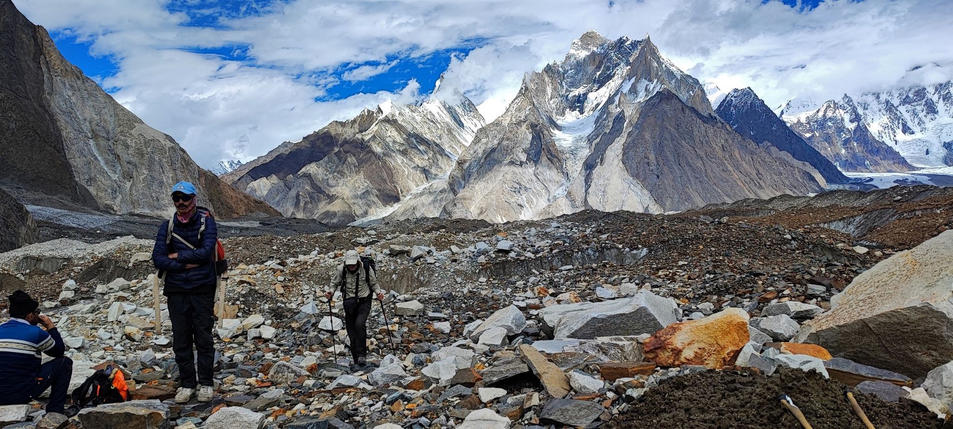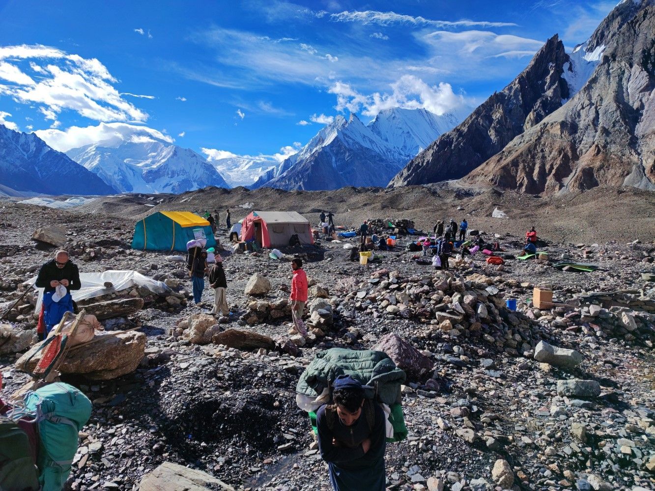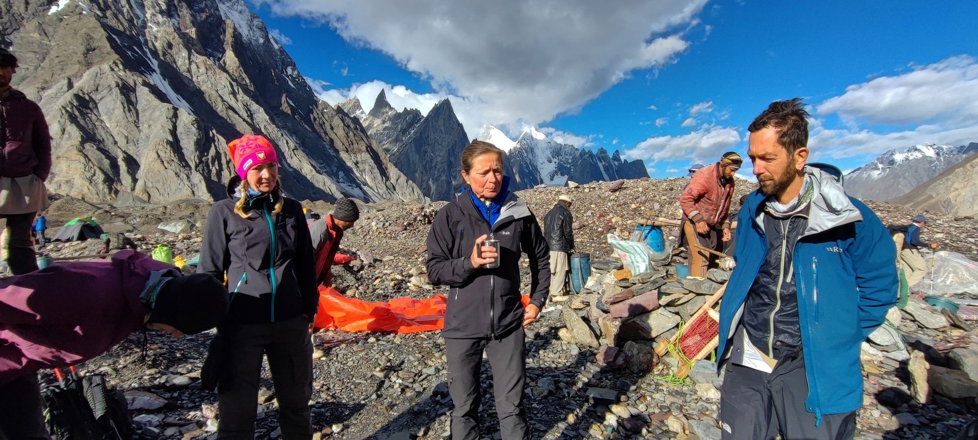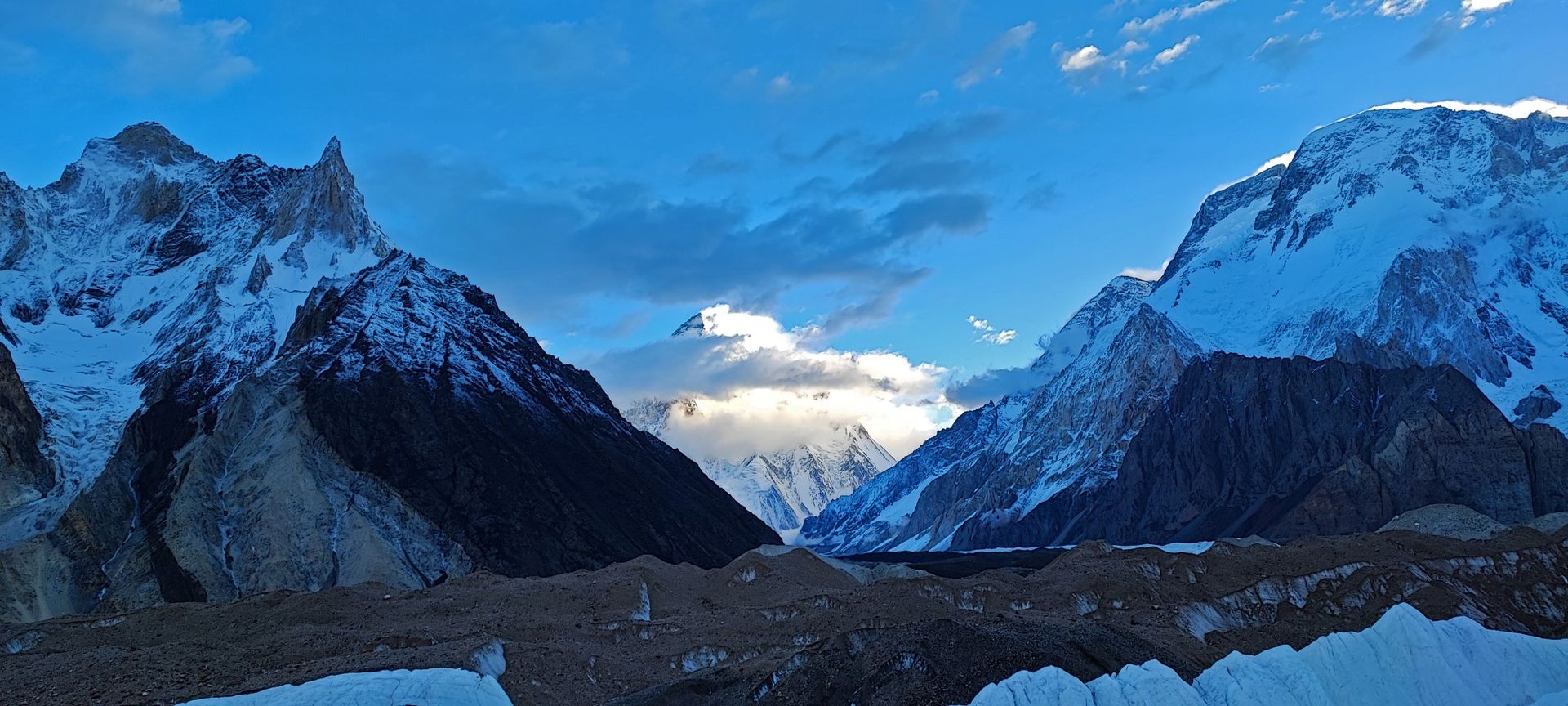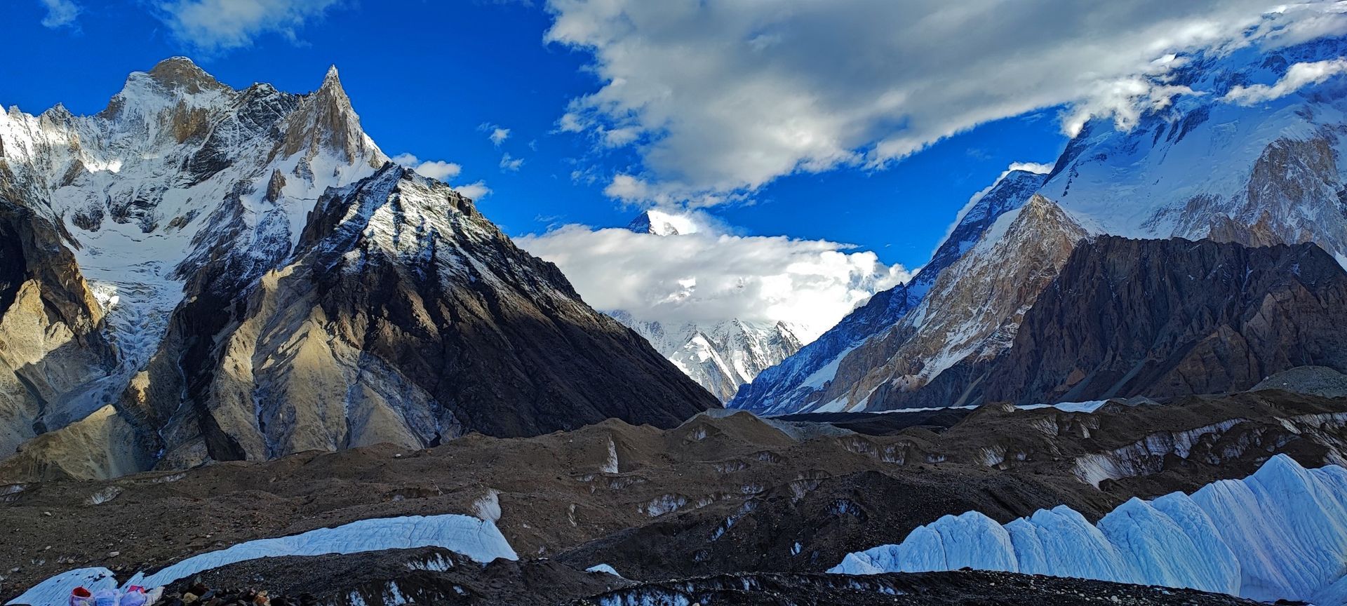 Het is een prachtige ochtend voor met een kop thee te genieten van de imposante bergen om ons heen, en een uur later is de K2 nog steeds te zien. Nadat Maaike de crew heeft toegesproken is het tijd om het kamp op te breken en te vertrekken naar Moonhill Camp ofwel Ali Camp. We volgen een veel minder bewandelde route langs de Upper Baltoro, een van de gletsjers die vanuit Chogolisa naar beneden komt en de enorme gletsjerknooppunten van Concordia voedt. Al na een klein uur lopen moeten we stuk afdalen over een gruisvrij deel van de gletsjer, spekglad dus. Met ze alle vormen we een treintje en gooien we steengruis op het gladde ijs om daarna met hulp van de crew veilig te kunnen afdalen. Het is hier even zoeken naar het juiste pad maar als we hoger komen wordt de gletsjer een grote vlakte van ijs.