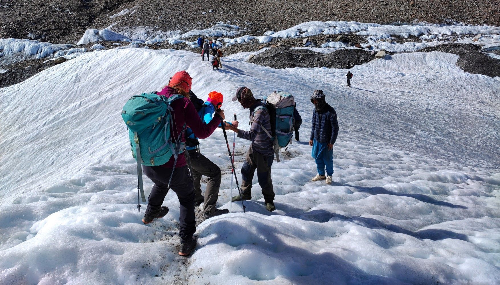 Al na een klein uur lopen moeten we stuk afdalen over een gruisvrij deel van de gletsjer, spekglad dus.