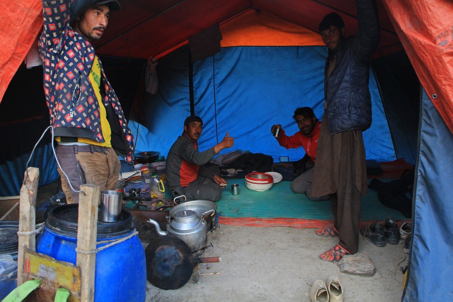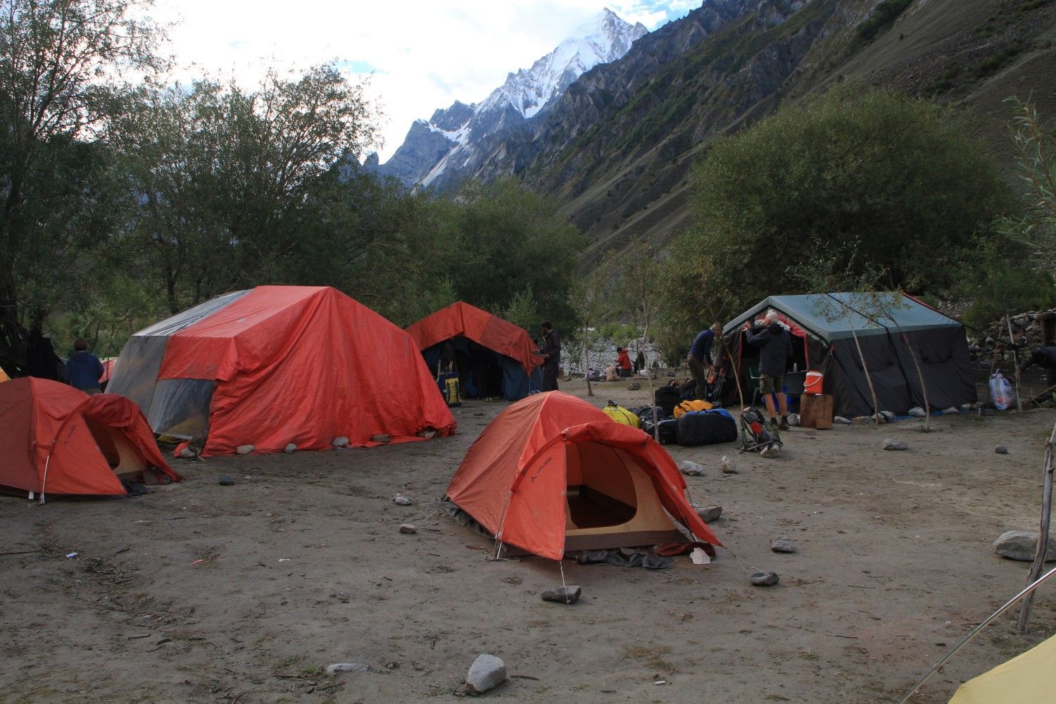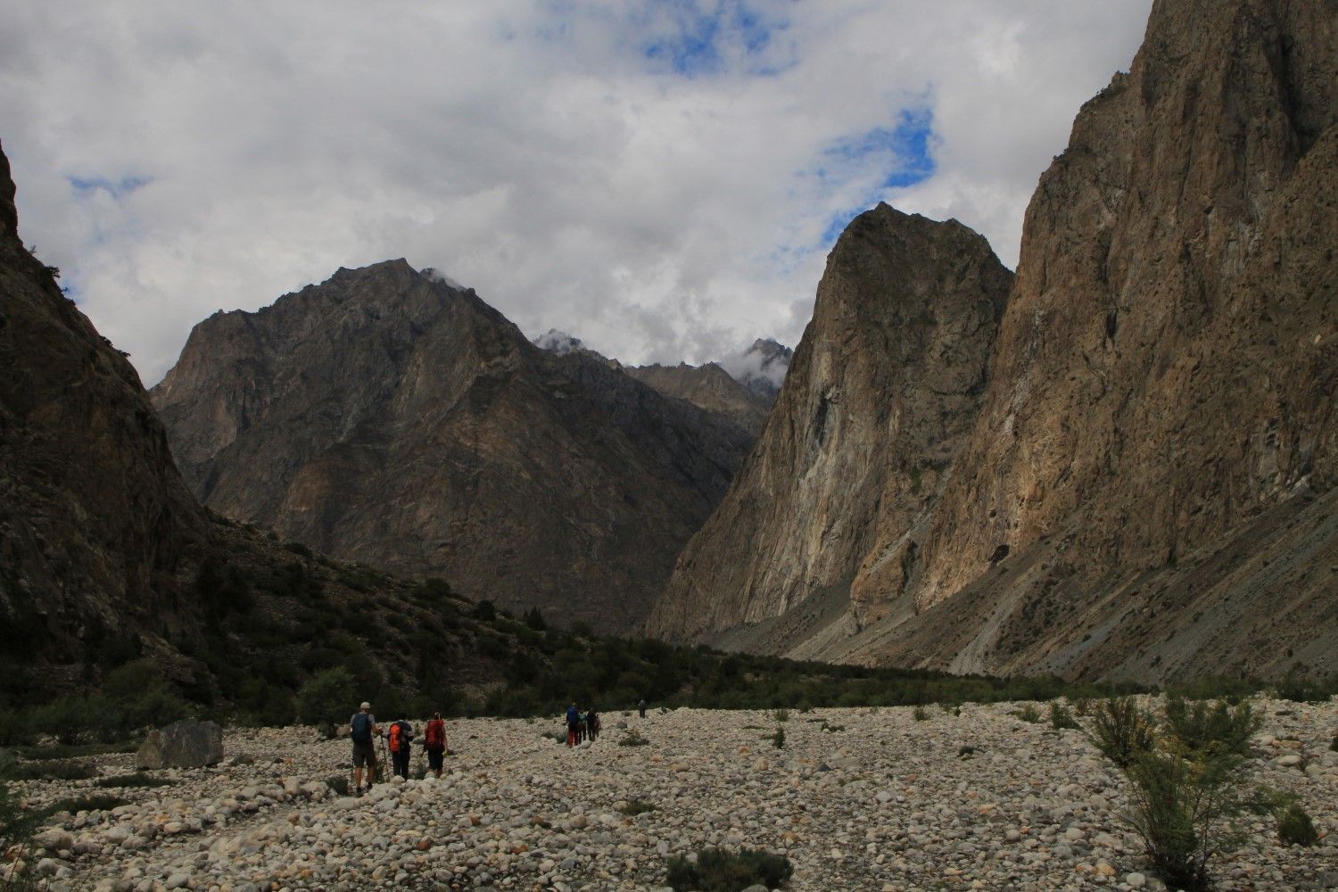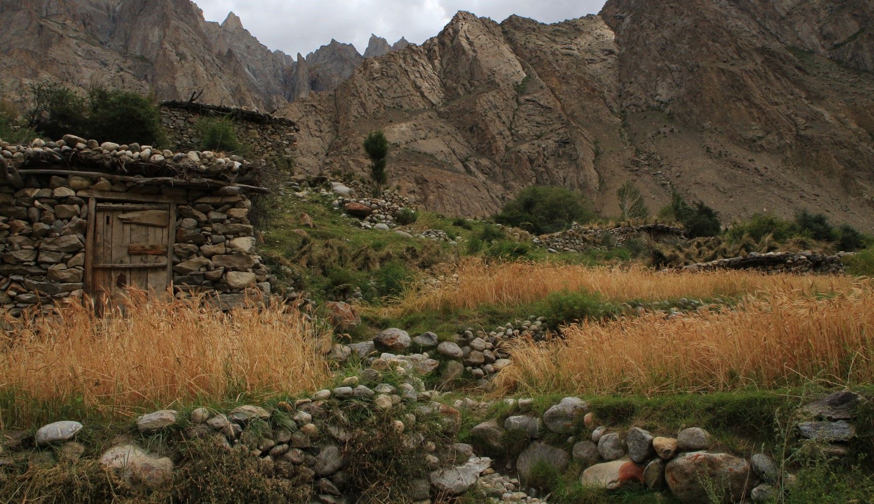 Een easy begin van de laatste wandeldag, genoeg tijd om nieuwe vrienden te maken met het naast mijn tent loslopende vee. Nog snel even een foto maken van de kookploeg in de kooktent. Ze deden fantastisch werk, ondanks dat ik niet alles kon en wou eten vanwege mijn diarree. Nog een blik naar de mooie bergen en dan vertrekken we om 8 uur richting Hushe. Eerst via een bruggetje de rivier over en daarna gaat het pad een stuk over de oude stenige rivierbedding. Een aantal keer draai ik mij om, om terug kijken naar de bergtoppen. Ondertussen komen we steeds meer in bewoond gebied, we passeren een koe voor een herdershut en niet veel later zien we de eerste terrassen met graan. En dan zien we Hushe liggen op een klein plateau. Maar voordat we het dorp in mogen moeten we ons eerst melden bij een check point. Ze laten daar trots zien dat de BBC in dit gebied de sneeuwluipaard gefilmd heeft.