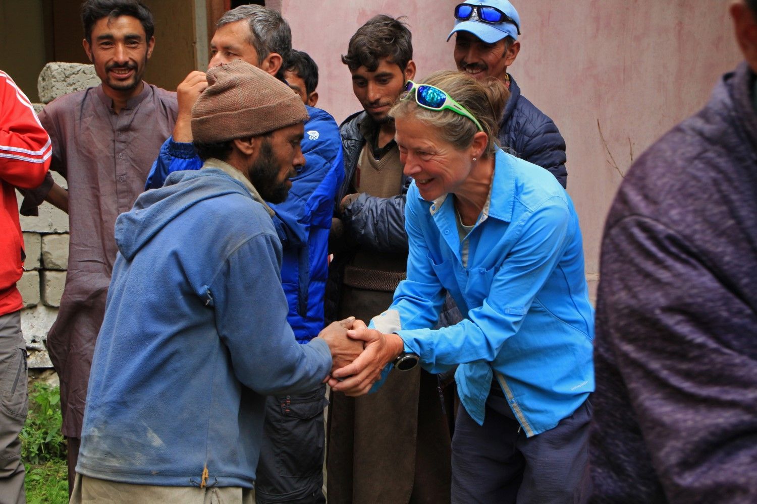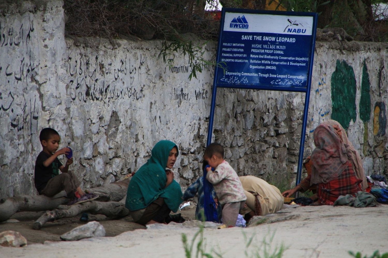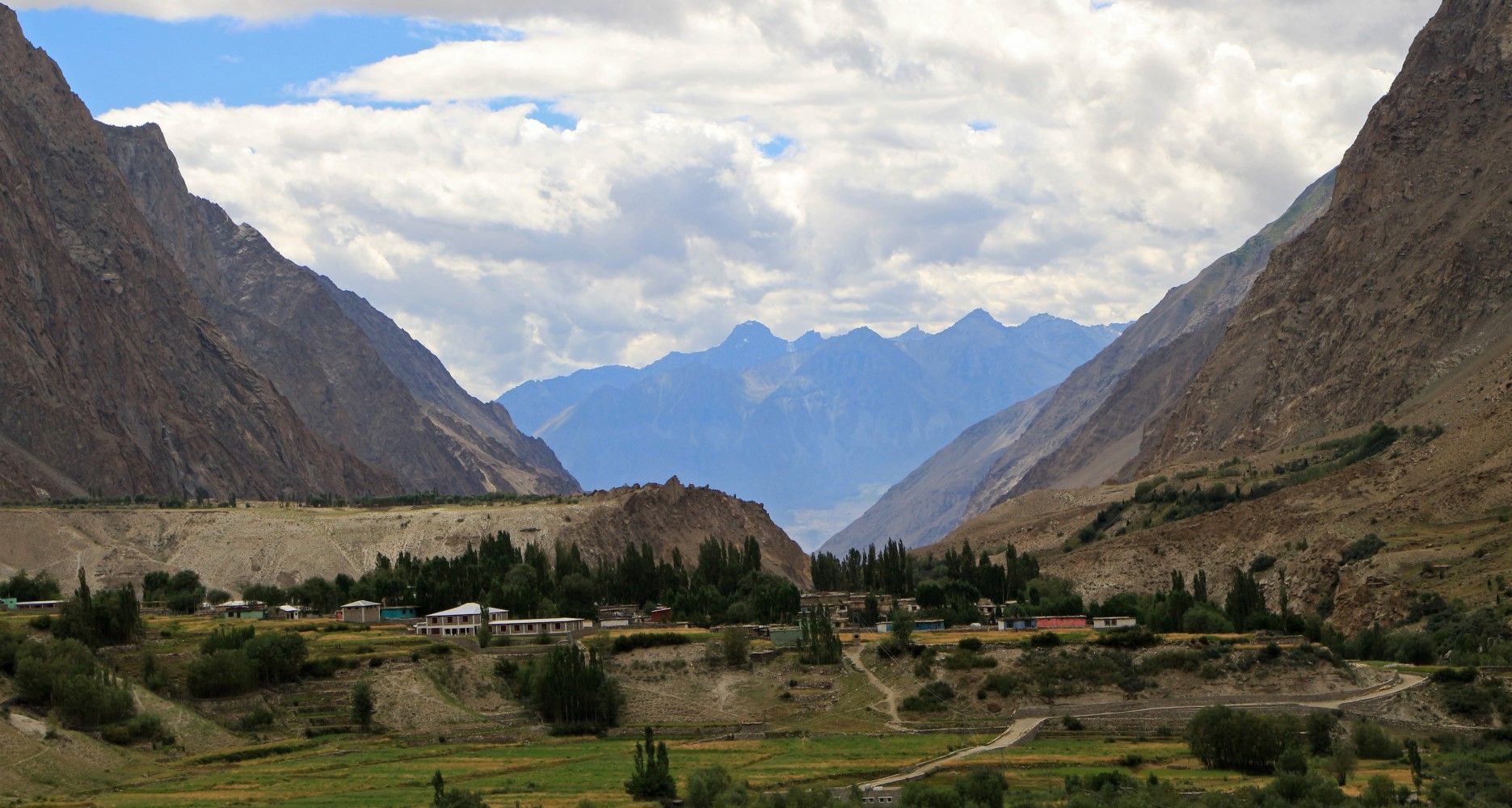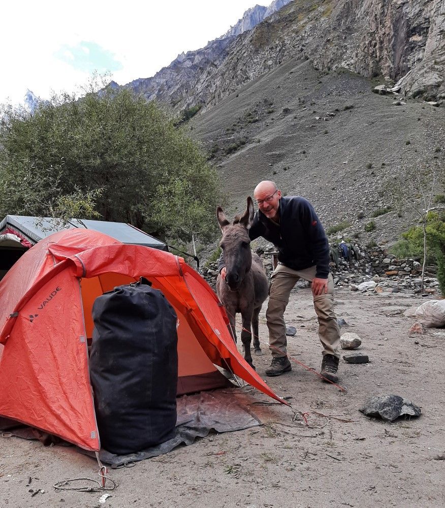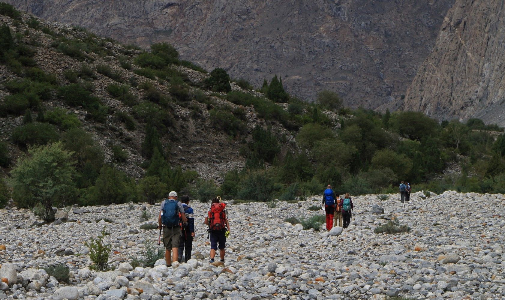 Een easy begin van de laatste wandeldag, genoeg tijd om nieuwe vrienden te maken met het naast mijn tent loslopende vee. Nog snel even een foto maken van de kookploeg in de kooktent. Ze deden fantastisch werk, ondanks dat ik niet alles kon en wou eten vanwege mijn diarree. Nog een blik naar de mooie bergen en dan vertrekken we om 8 uur richting Hushe. Eerst via een bruggetje de rivier over en daarna gaat het pad een stuk over de oude stenige rivierbedding. Een aantal keer draai ik mij om, om terug kijken naar de bergtoppen. Ondertussen komen we steeds meer in bewoond gebied, we passeren een koe voor een herdershut en niet veel later zien we de eerste terrassen met graan. En dan zien we Hushe liggen op een klein plateau. Maar voordat we het dorp in mogen moeten we ons eerst melden bij een check point. Ze laten daar trots zien dat de BBC in dit gebied de sneeuwluipaard gefilmd heeft.