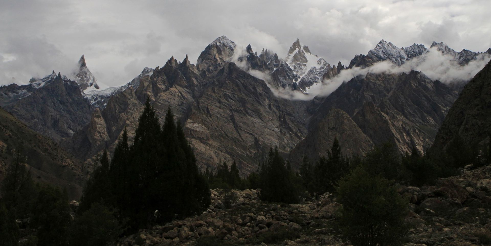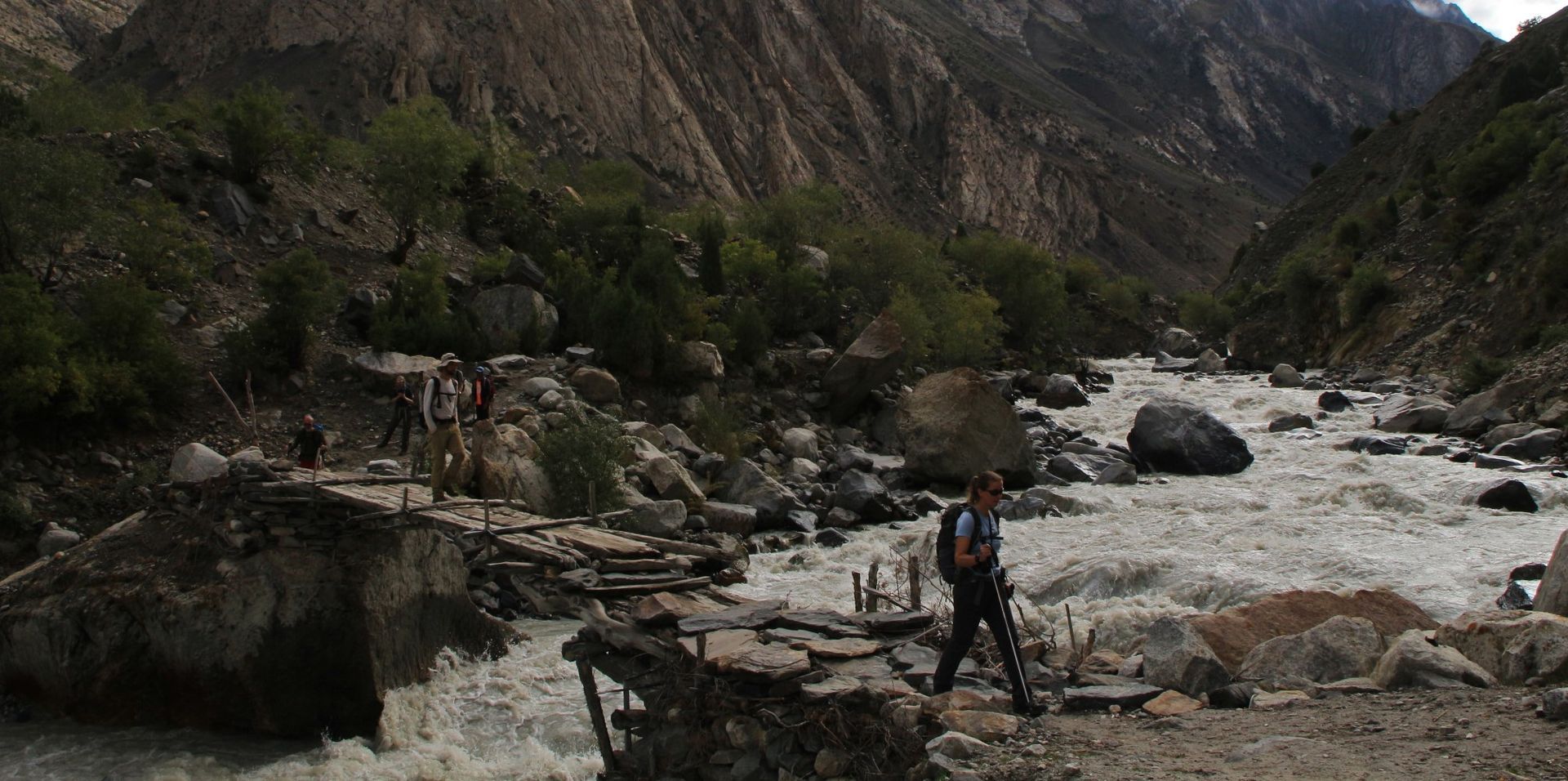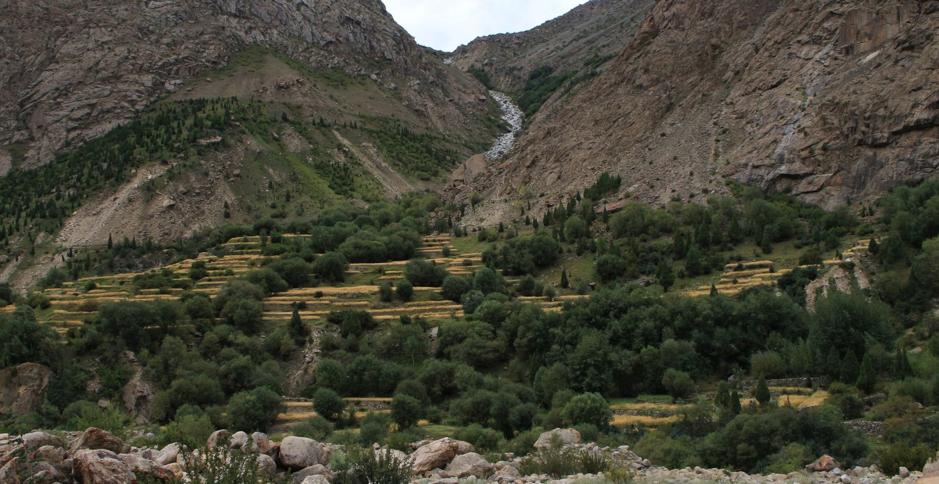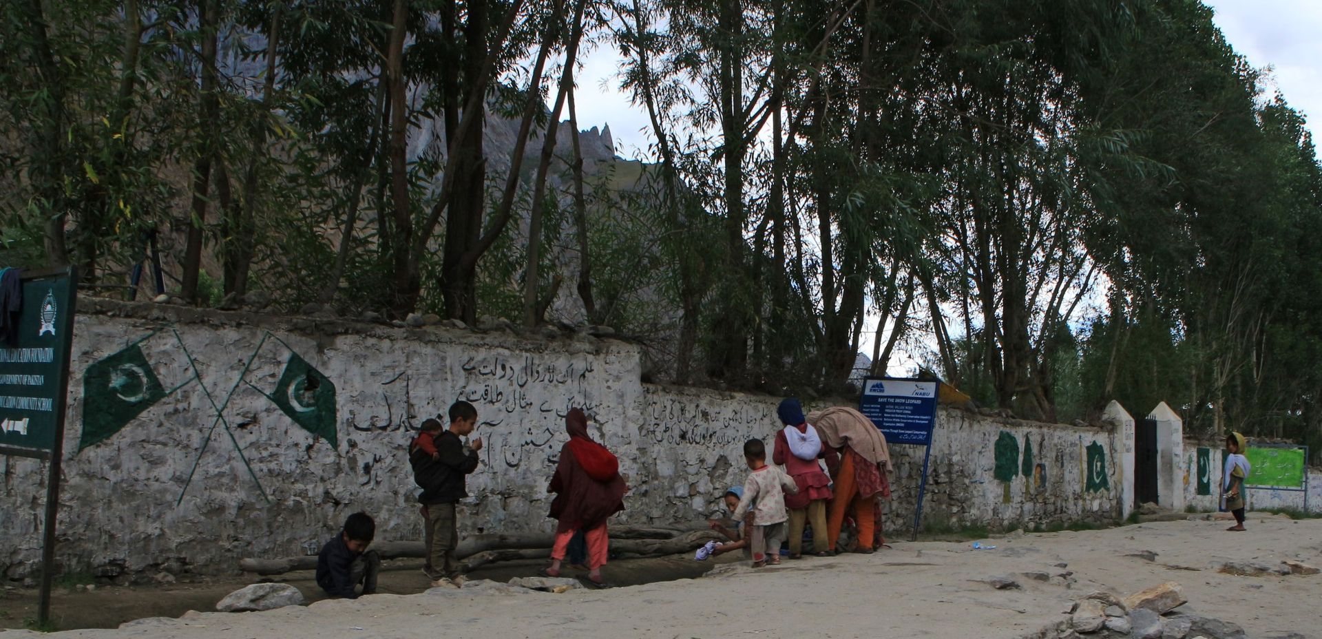 Een easy begin van de laatste wandeldag, genoeg tijd om nieuwe vrienden te maken met het naast mijn tent loslopende vee. Nog snel even een foto maken van de kookploeg in de kooktent. Ze deden fantastisch werk, ondanks dat ik niet alles kon en wou eten vanwege mijn diarree. Nog een blik naar de mooie bergen en dan vertrekken we om 8 uur richting Hushe. Eerst via een bruggetje de rivier over en daarna gaat het pad een stuk over de oude stenige rivierbedding. Een aantal keer draai ik mij om, om terug kijken naar de bergtoppen. Ondertussen komen we steeds meer in bewoond gebied, we passeren een koe voor een herdershut en niet veel later zien we de eerste terrassen met graan. En dan zien we Hushe liggen op een klein plateau. Maar voordat we het dorp in mogen moeten we ons eerst melden bij een check point. Ze laten daar trots zien dat de BBC in dit gebied de sneeuwluipaard gefilmd heeft.