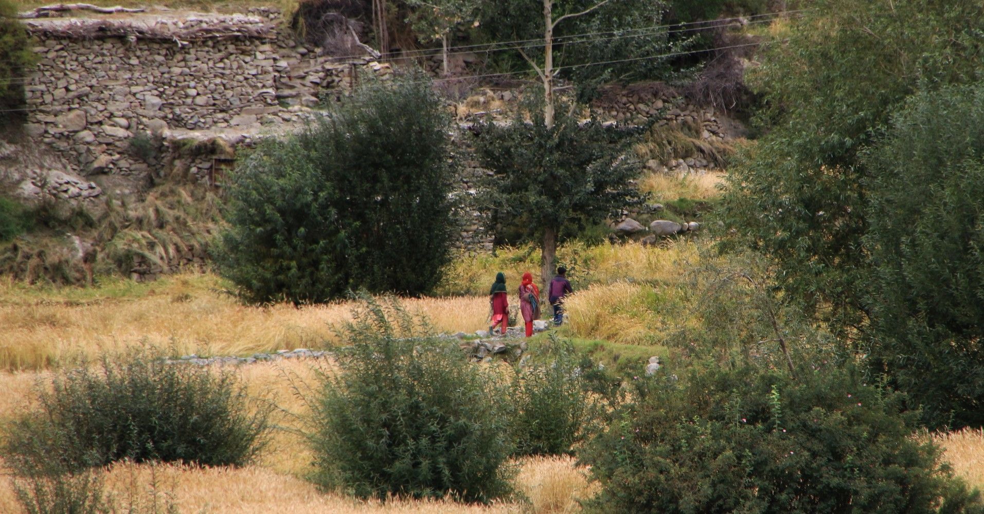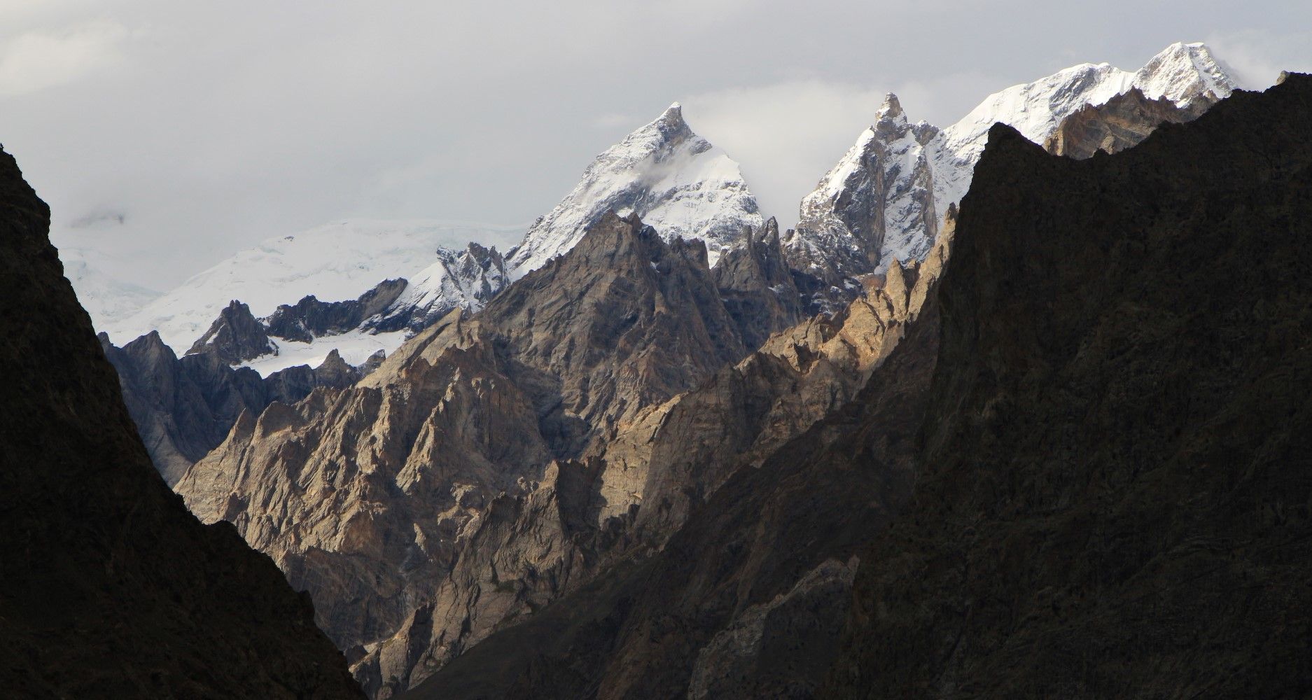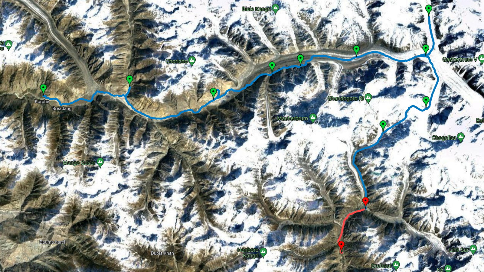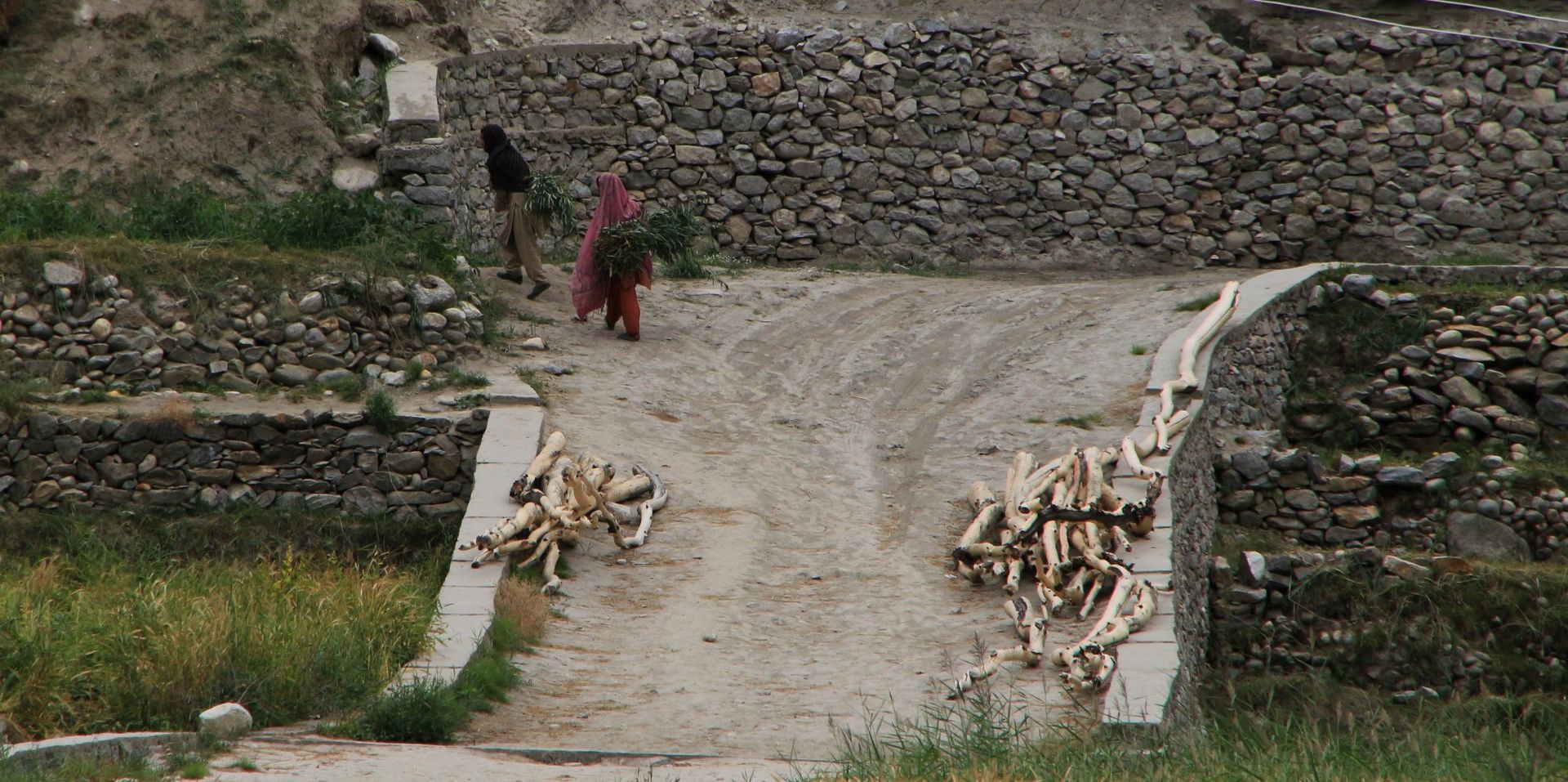 Een easy begin van de laatste wandeldag, genoeg tijd om nieuwe vrienden te maken met het naast mijn tent loslopende vee. Nog snel even een foto maken van de kookploeg in de kooktent. Ze deden fantastisch werk, ondanks dat ik niet alles kon en wou eten vanwege mijn diarree. Nog een blik naar de mooie bergen en dan vertrekken we om 8 uur richting Hushe. Eerst via een bruggetje de rivier over en daarna gaat het pad een stuk over de oude stenige rivierbedding. Een aantal keer draai ik mij om, om terug kijken naar de bergtoppen. Ondertussen komen we steeds meer in bewoond gebied, we passeren een koe voor een herdershut en niet veel later zien we de eerste terrassen met graan. En dan zien we Hushe liggen op een klein plateau. Maar voordat we het dorp in mogen moeten we ons eerst melden bij een check point. Ze laten daar trots zien dat de BBC in dit gebied de sneeuwluipaard gefilmd heeft.