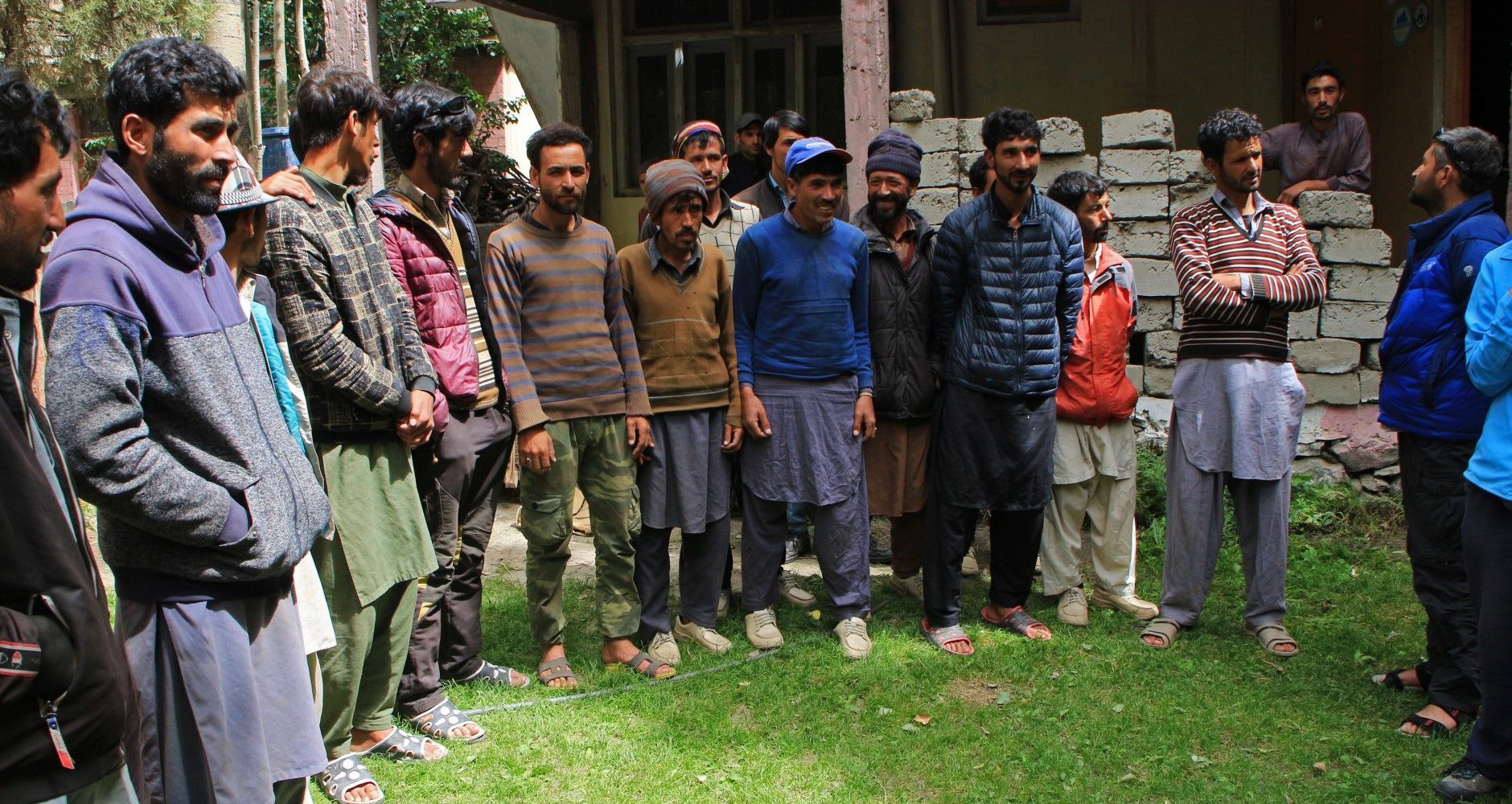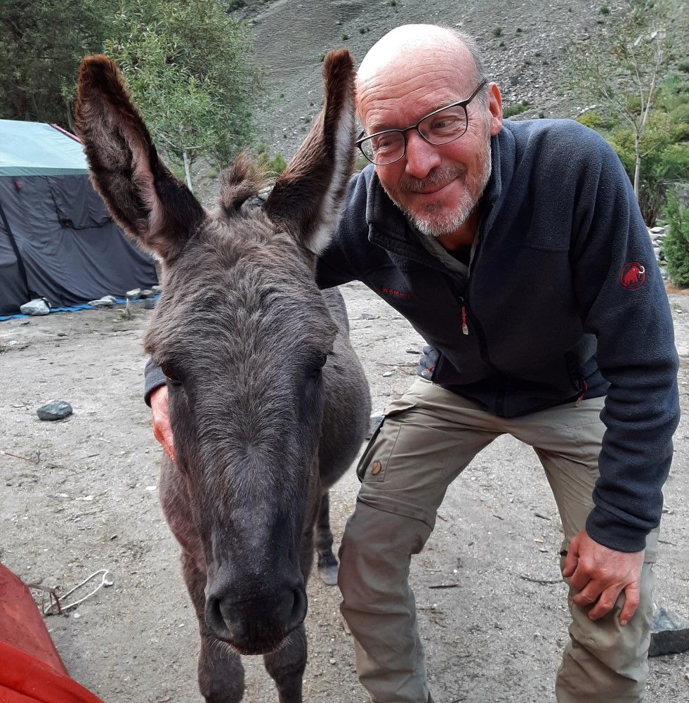 Het voelt een beetje onwennig om weer in de bewoonde wereld te zijn en mensen te zien. In de tuin achter een huis zetten wij voor het laatst onze tenten op. En dan is het tijd om afscheid te nemen van onze dragers. Staand in een kring spreekt Bram een mooi dankwoord uit namens ons allemaal, ze deden geweldig werk en waren zeer behulpzaam. Ik geef mijn kapotte schoenen via Abbas aan een drager, misschien kan hij er nog wat mee. Ik maak nog een aantal close ups van de dragers voordat ze langs Maaike lopen om hun fooi te ontvangen. De groepsfoto mag natuurlijk niet ontbreken.