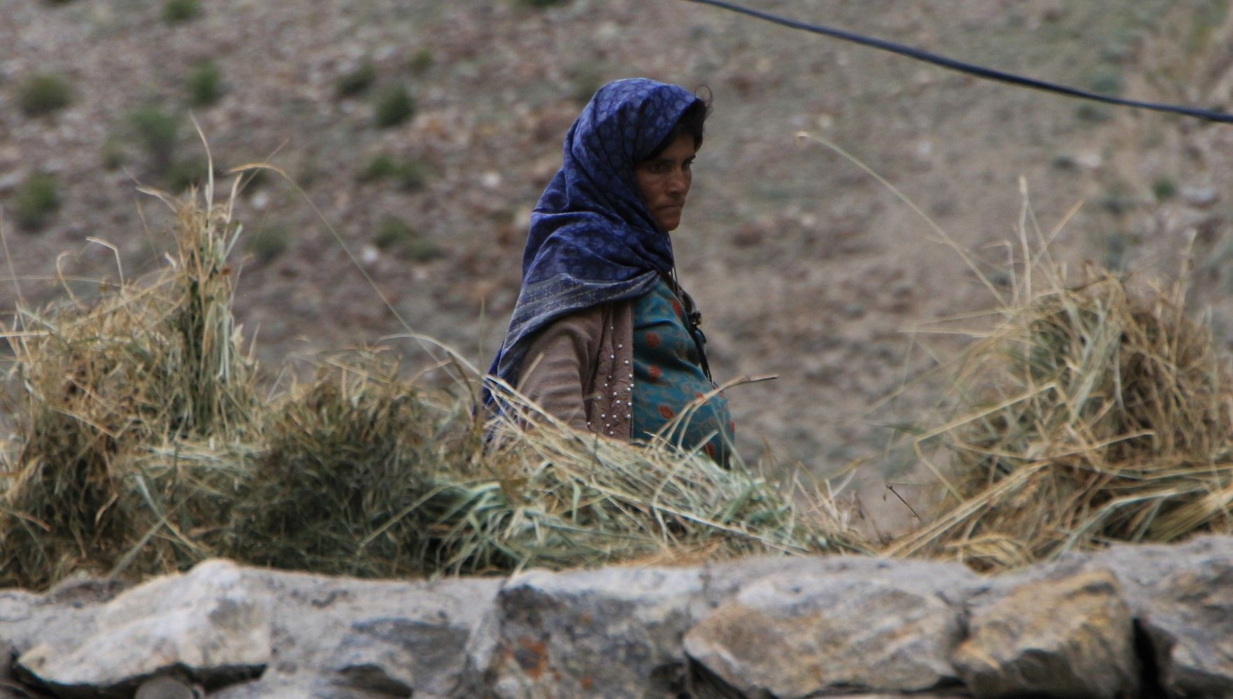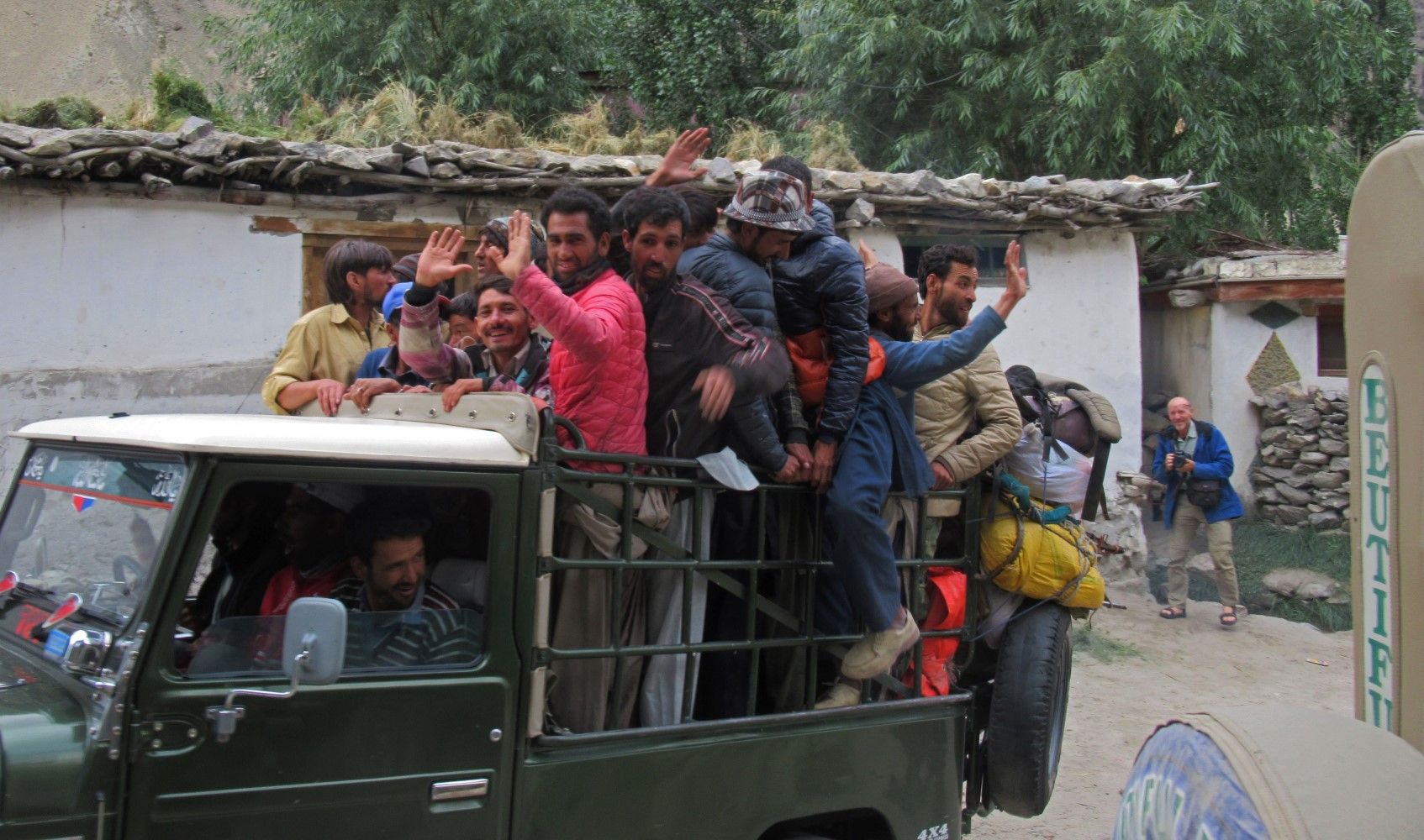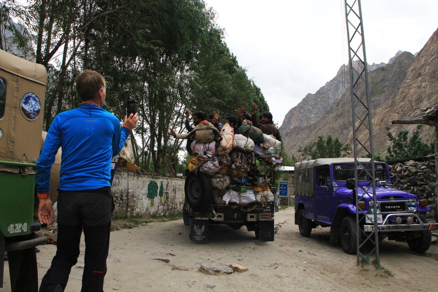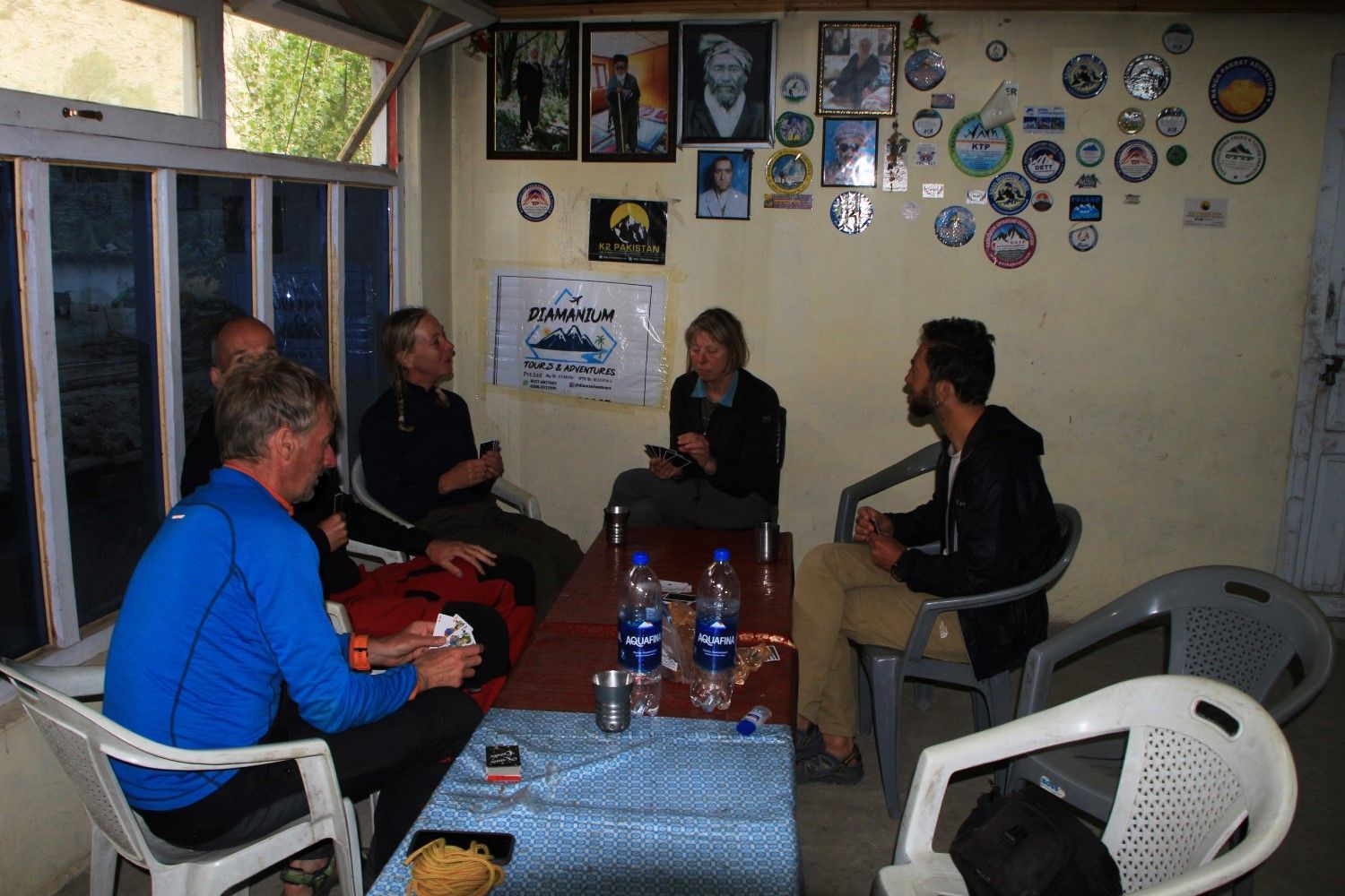 En dan worden wij aan het werk gezet, o.a. de tenten en stijgijzers moeten schoongemaakt worden. Als dat klaar is, kunnen we even lekkere dingen shoppen in een winkeltje vlak bij. Er wordt door Abbas afgeraden om alleen het dorp verder te verkennen. Ik doe dat dan ook niet en loop alleen door de straat waar wij verblijven. Ik ben daardoor ook terughoudend om foto's van mensen te schieten en maak ze daarom stiekem uit de losse pols. Een aantal kinderen en jonge meiden zitten in een stroompje de was te doen. Een vrouw houd ons vanaf het dak in de gaten. De haan daarentegen poseert heel gewillig. Nog een allerlaatste foto van de bergen en dan is het tijd om de dragers uit te zwaaien. Ik ben er net te laat en zie ze alleen nog in een volgepropte pickup wegrijden. Om de laatste uurtjes te doden spelen we een aantal spelletjes pesten, heb ik toch niet voor niets de kaarten meegenomen.
