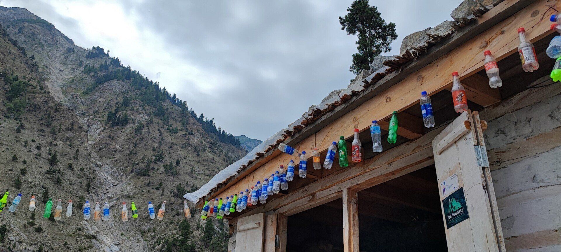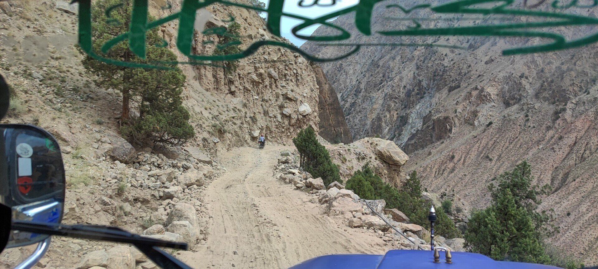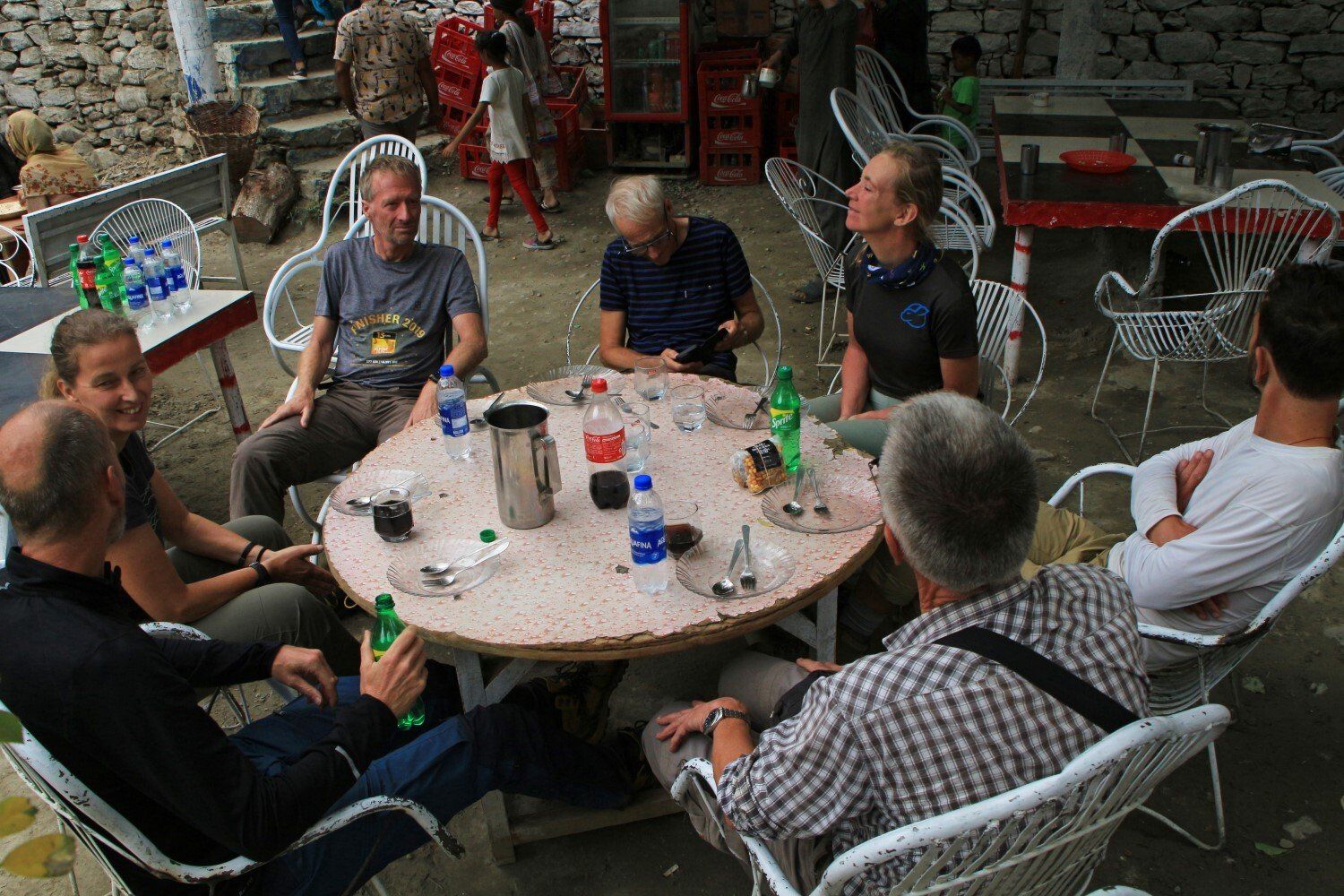 Weer een mooie zonsopkomst op de Nanga Parbat, echter slechts van korte duur, want al gauw heeft de bewolking de overhand. Nog even snel wat foto's van onze hut gemaakt, want even na 7 uur zijn we al op pad met een laatste blik op de Nanga Parbat. Onderweg komen we al bouwvakkers met bouwmateriaal op hun rug tegen. Bij de tuck shop onderweg hangt zijn assortiment aan de waslijn. Na 6 km afdalen arriveren we in Tato en stappen we weer in de jeeps. We zitten nu met zijn vieren in een jeep want een jeep wilde niet starten, maar ik mag dit keer wel voorin zitten, dus mooi uitzicht om filmpjes en foto's te maken van de spectaculaire afdaling. Als we een tegenligger tegenkomen, moeten we een heel stuk achteruit voordat we elkaar kunnen passeren. Onze chauffeur, met zijn prachtige snor, rijdt heel behoedzaam en we komen daarom als laatste aan in Raikot Bridge. Hier staat een prachtige druk versierde vrachtwagen geparkeerd waar ik wel foto's van moet maken. De chauffeur poseert trots voor zijn vrachtwagen, wat achteraf echter een toeristenbus blijkt te zijn.