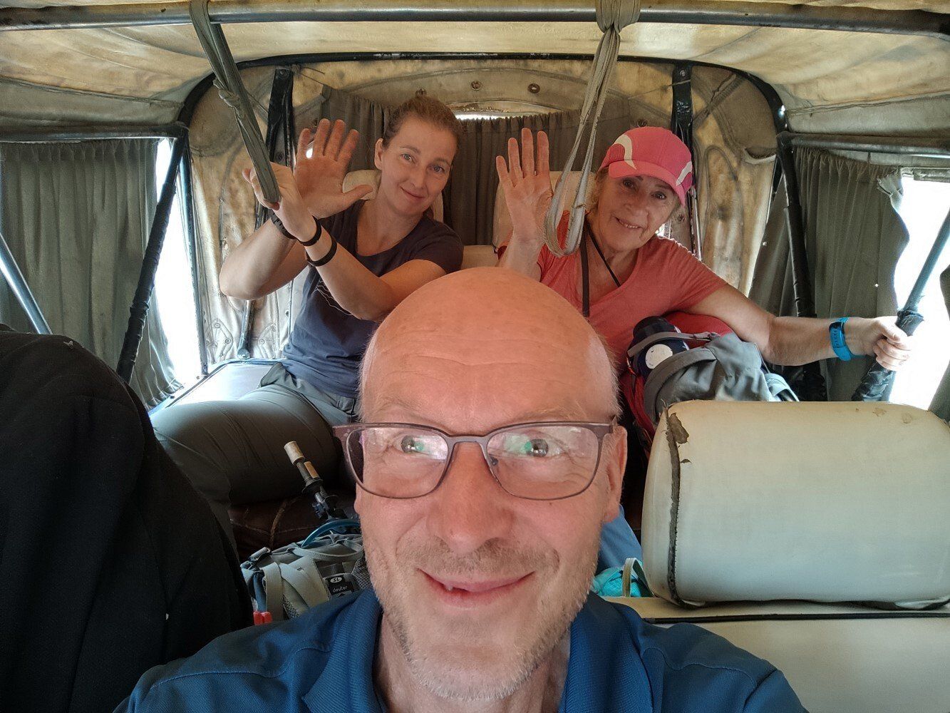 We zitten nu met zijn vieren in een jeep want een jeep wilde niet starten, maar ik mag dit keer wel voorin zitten...