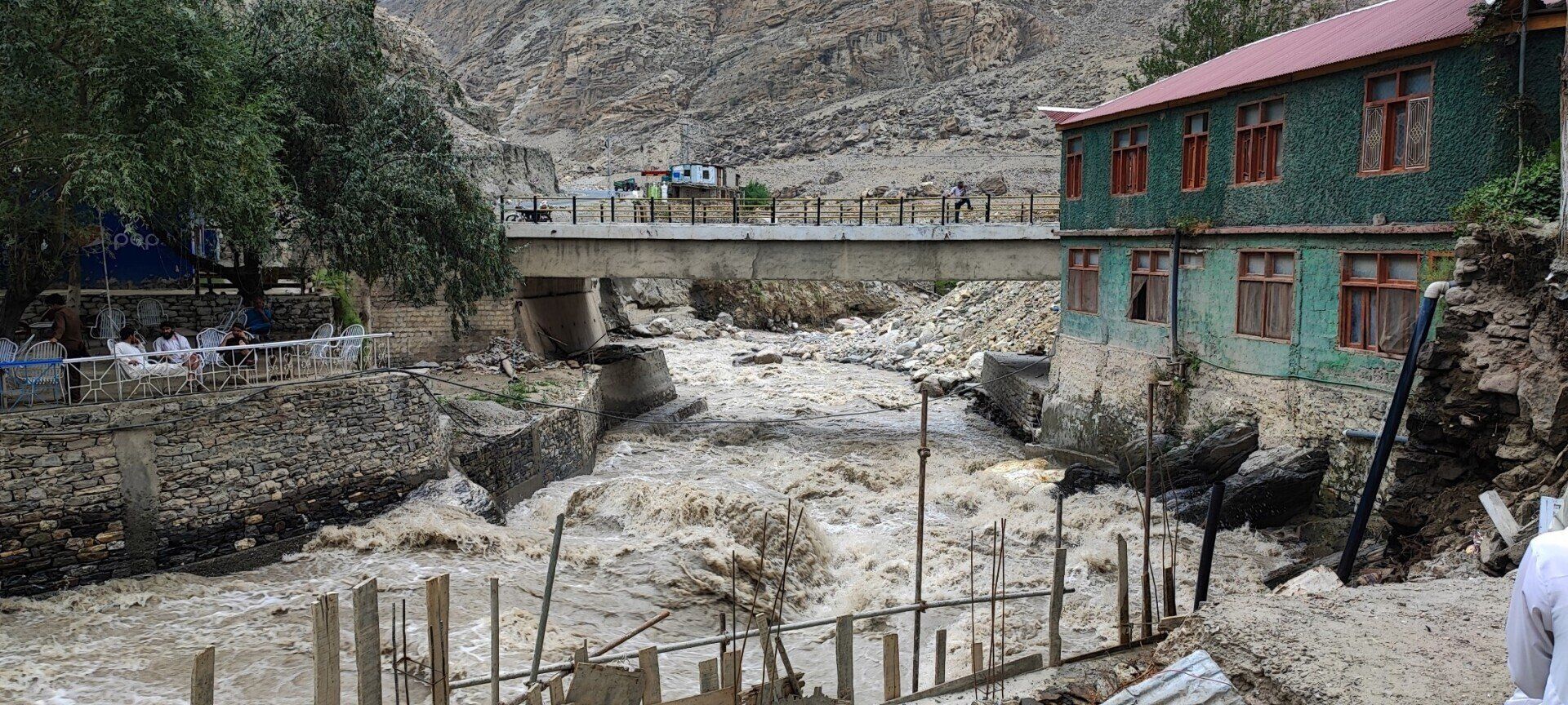 Met de minibus reizen we verder over de Karakorum High Way. We maken een stop op het kruispunt van de 3 bergketens met de hoogste bergen, de Hindu Kush, de Karakorum en de Himalaya. Net voor Gilgit slaan we af en verlaten we de Karakorum High Way richting Skardu, de weg wordt nu nog smaller en kronkelt mee met de woest stromende rivier. Onderweg moeten we stoppen bij een landslide of gewoon werk aan de weg, want er is gelukkig groot materieel aanwezig en we kunnen snel verder. Vlak naast een kolkende zijrivier lunchen we op het terras van een restaurant. In de brede vallei van Skardu is de rivier Indus, vanwege de overvloedige smelt- en regenwater, een meer geworden, op Google satelliet is geen meer te zien. In de verte veroorzaken de wind op de zandbanken flinke zand/stof wolken.
