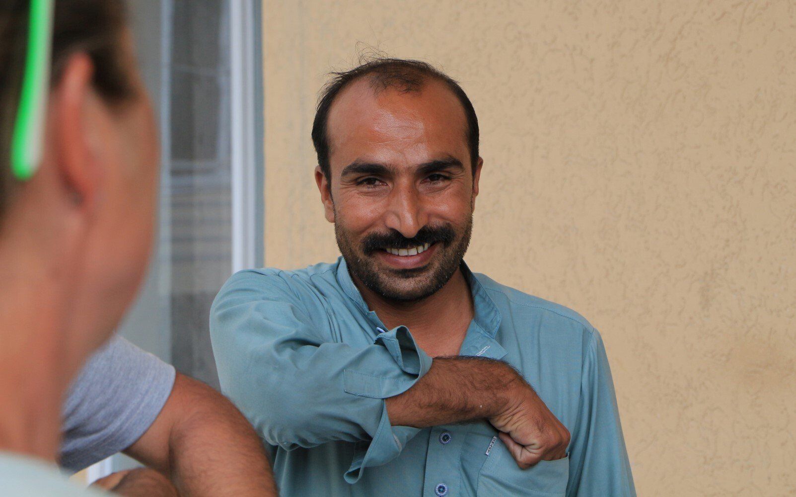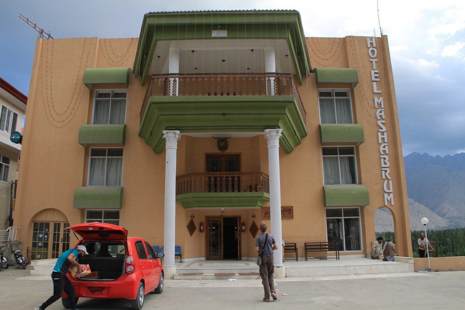 Bij aankomst in Hotel Mashabrum nemen we afscheid van onze chauffeur die heel tevreden zijn fooi in zijn borstzak stopt.
