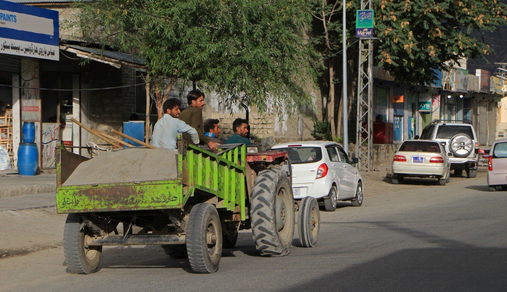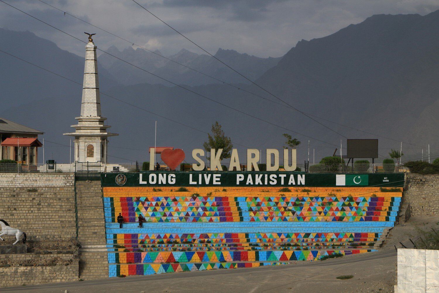 Skardu is als toegangspoort tot de K2 een van de meest toeristische plekken van het land. Bij aankomst in Hotel Mashabrum nemen we afscheid van onze chauffeur die heel tevreden zijn fooi in zijn borstzak stopt. In de Skardu hebben we nog tijd om wat te shoppen. Vier mannen op een tractor hebben veel oog voor ons. De dames onder ons blijken zich ongemakkelijk te voelen hier op straat, tenminste niet zo vrij als in Islamabad. Ons hoofddoel is om wat snack voor tijdens de trekking te kopen, in een notenwinkel koop ik dadels en gedroogde abrikozen, een lokale specialiteit. We slenteren verder naar het einde van de straat, tot aan een soort stadion, een regenboog verschijnt er boven. een prachtige muurschildering wijst ons op het K2 Museum, maar is op vrijdag helaas gesloten, net als vele winkels in de straat. Maar er is nog genoeg te zien, zoals diverse marktkraampjes. Wanneer de marktkoopmannen geen klandizie hebben, wordt er gezellig gekletst of telefoneert naar huis. Een koe slentert ook door de straat, drie mannen zitten op een bankje. Er is een echte taxi-standplaats voor scooters, 4 of 5 man op een scooter moet kunnen. Vijf man op de bumper van een taxibusje is ook geen probleem. bijna terug in het hotel staat de regenboog nog steeds boven Skardu. Maar eerst even in een souvenirwinkel een Pakistaans hoofddeksel, een pakol, gekocht. Uiteindelijk is het een bruine zonder veer geworden.
