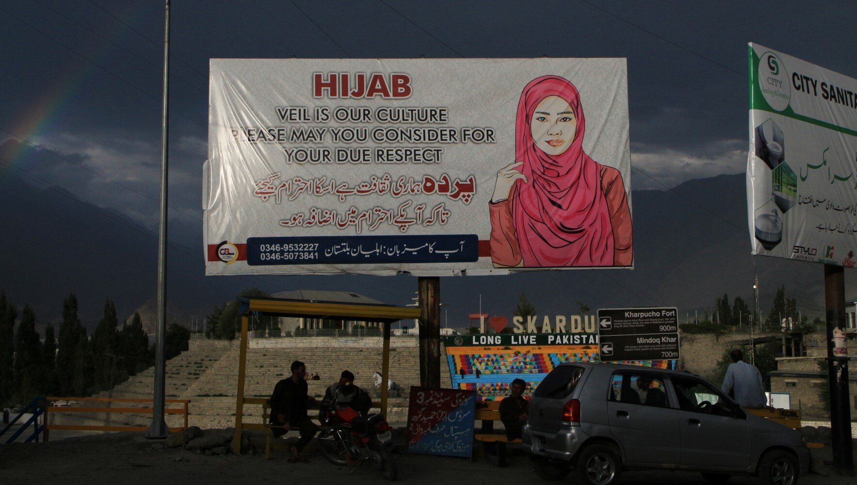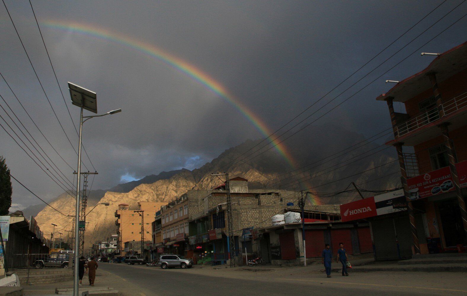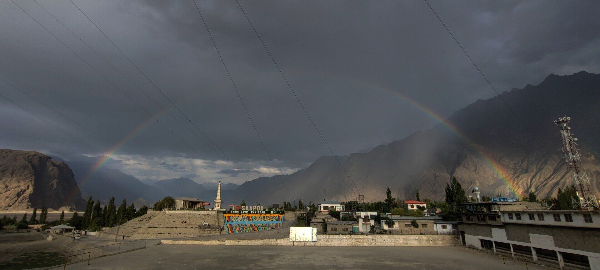 Bijna terug in het hotel staat de regenboog nog steeds boven Skardu.