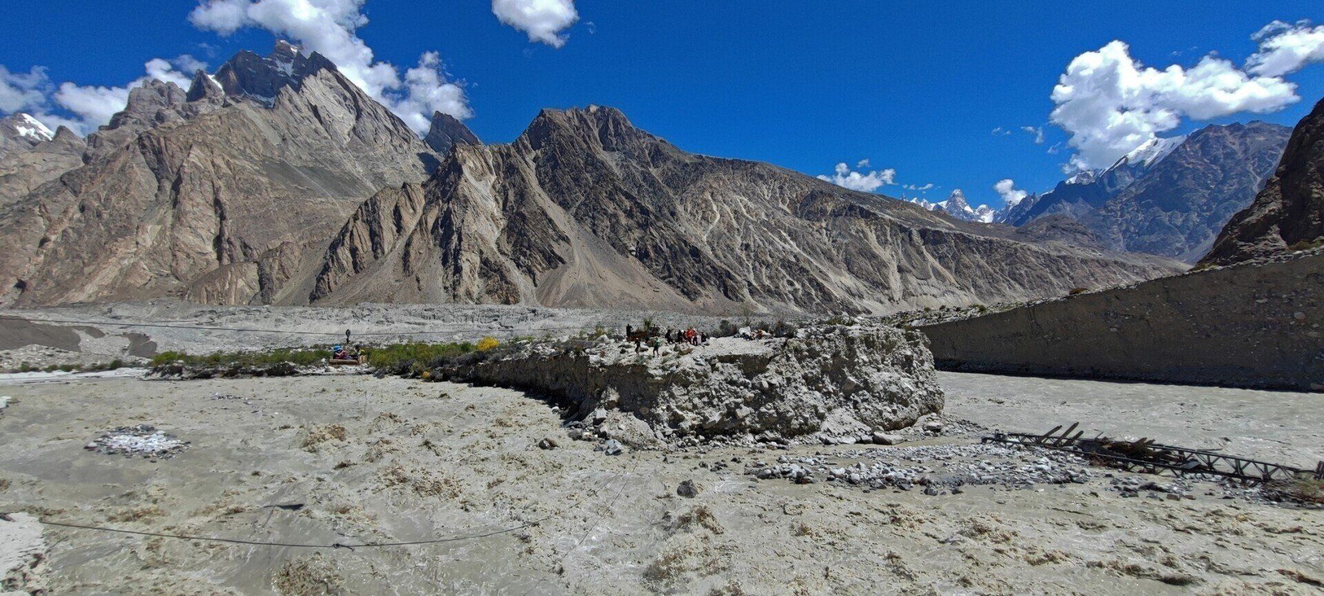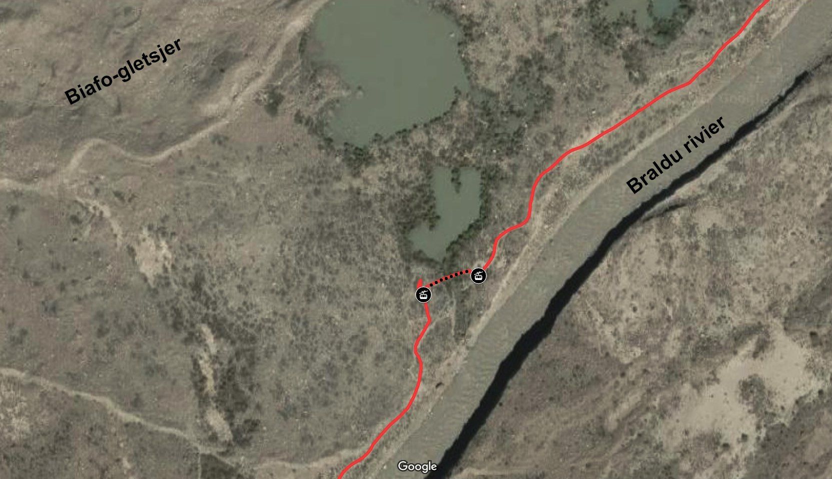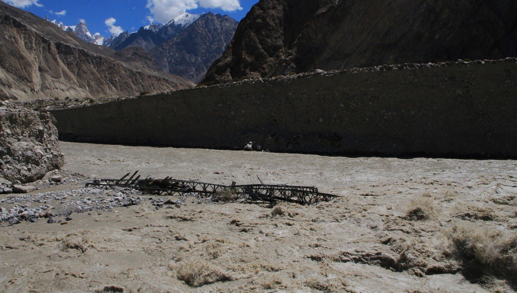 het smeltwater van de Biafo Gletsjer heeft een brug weggeslagen.