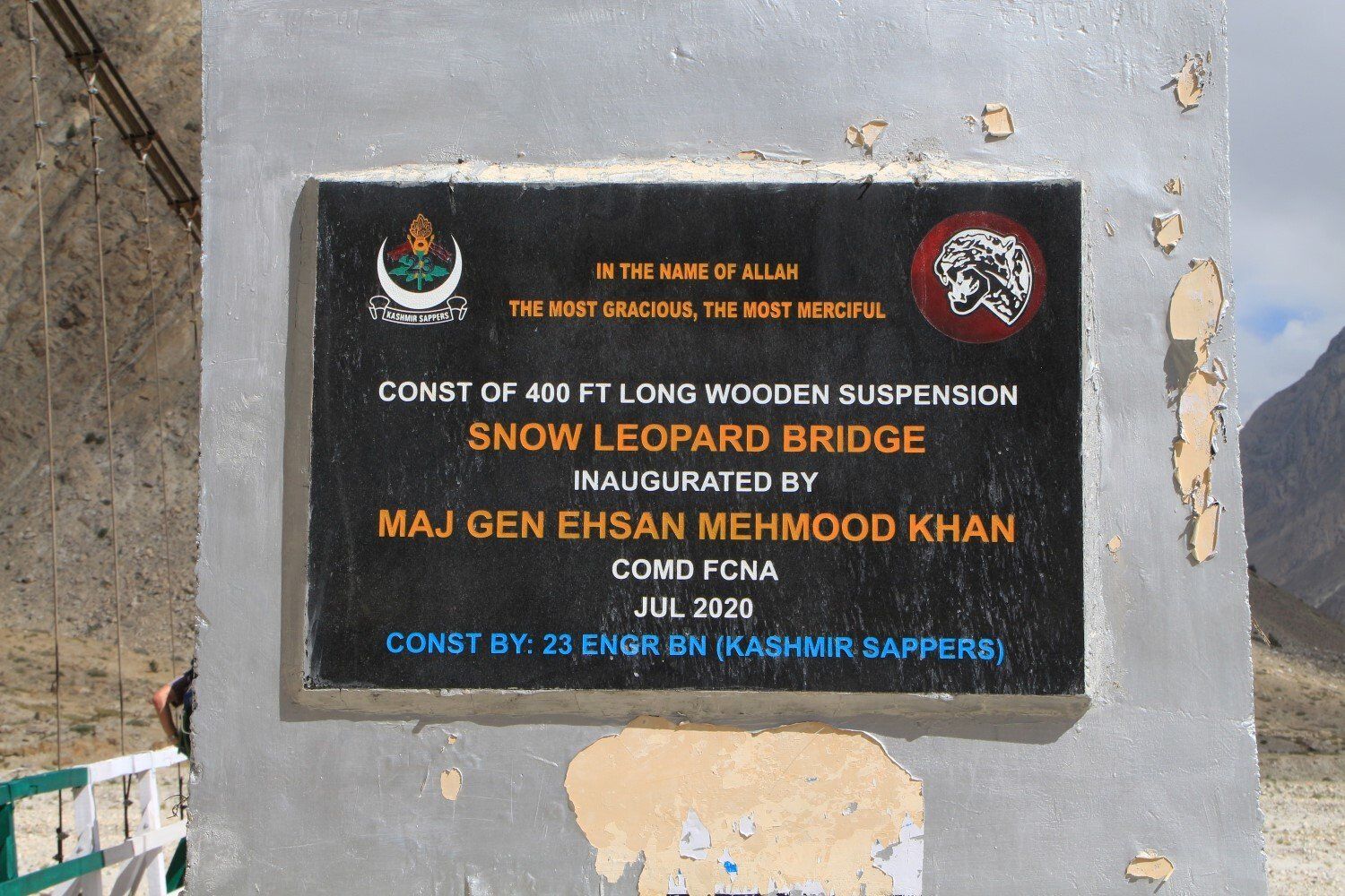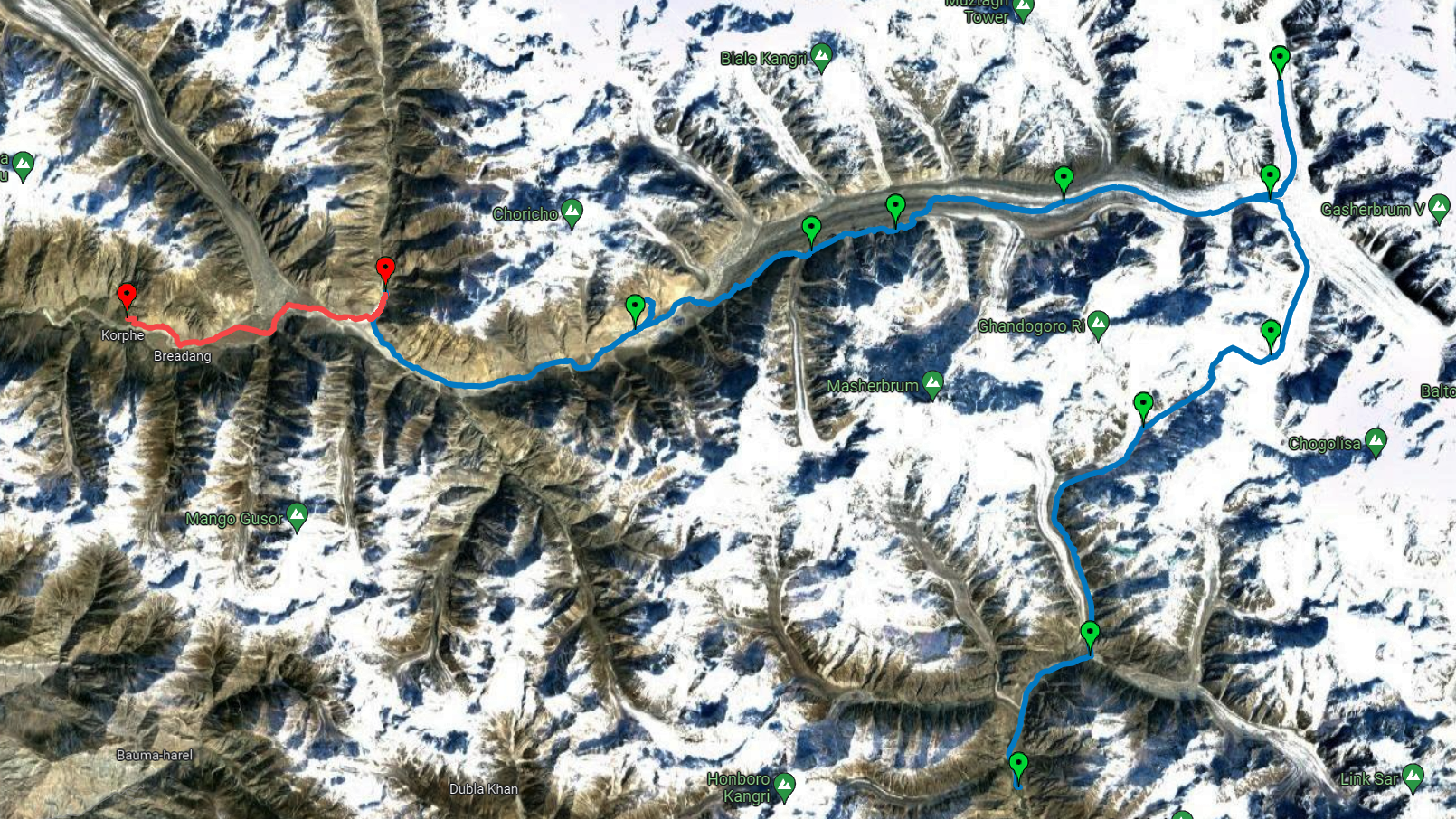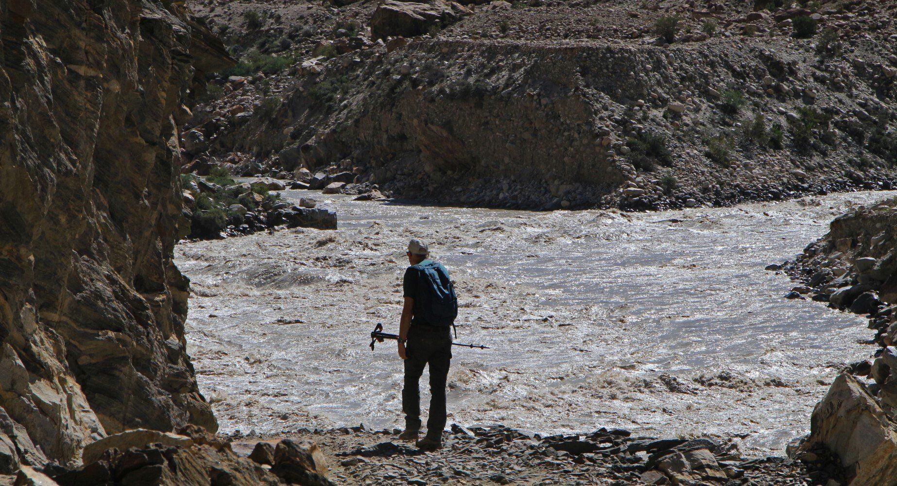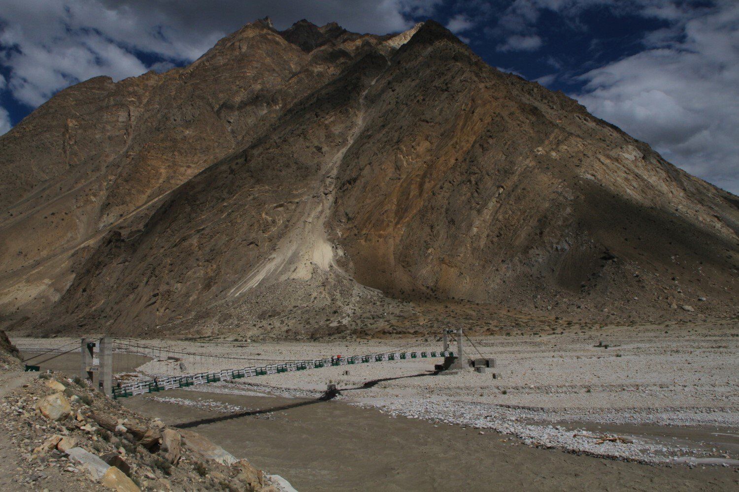 het smeltwater van de Biafo Gletsjer heeft een brug weggeslagen.