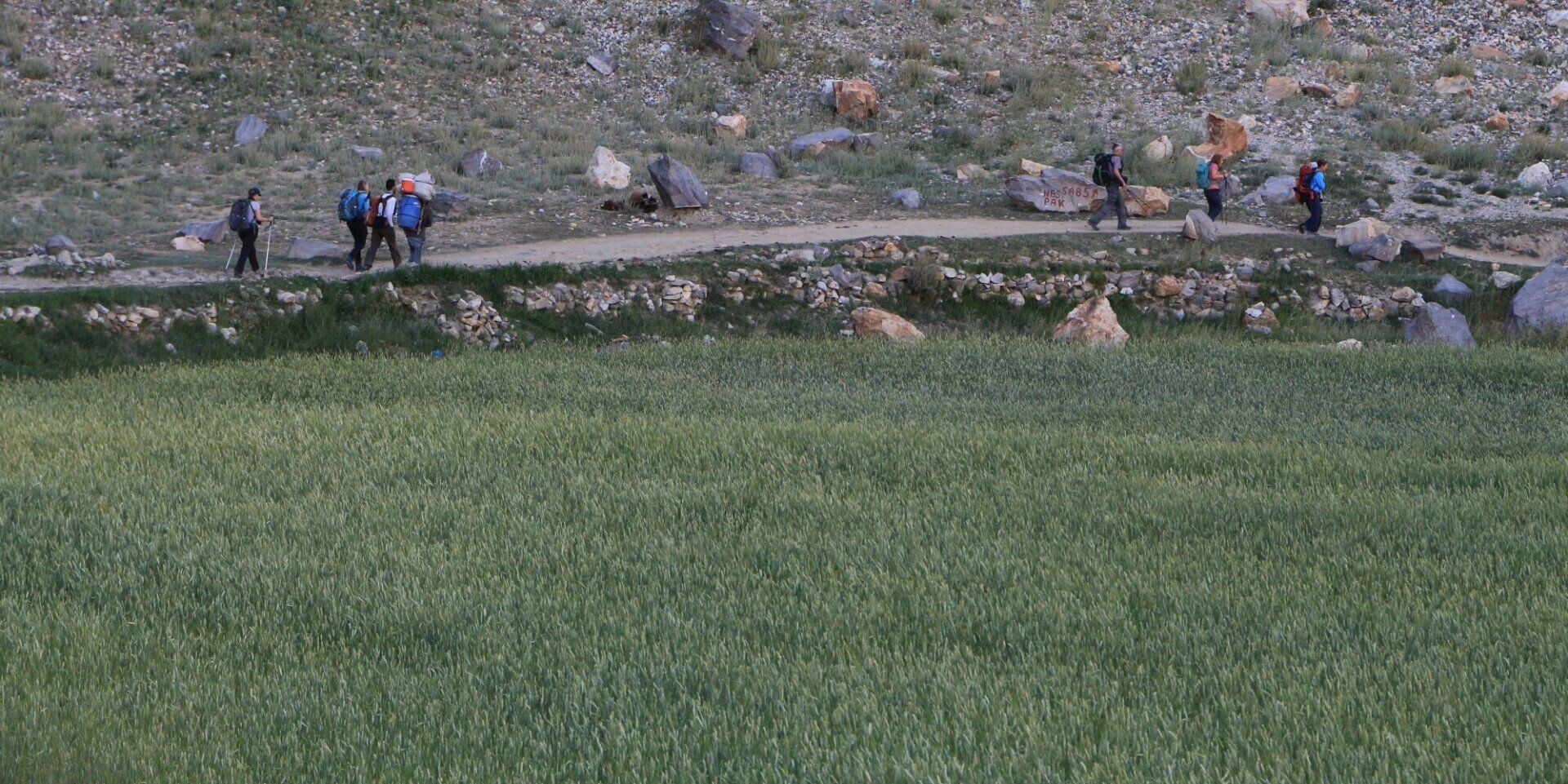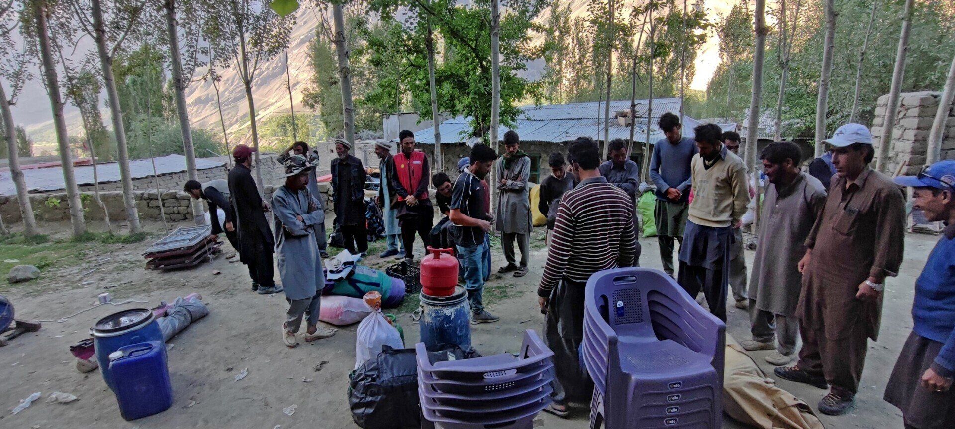 Om 5 uur ben ik al op, om rustig mijn plunjebaal te pakken en de tent af te breken. Ik heb ook nog tijd een bergtop door de struiken te fotograferen. We willen al om 7 uur lopen vanwege de hitte, maar dat lukt niet helemaal omdat het verdelen van alle spullen over de dragers en de muilezels veel tijd kost. De bagage wordt zelfs gewogen. Maar uiteindelijk zijn we nog voor half 8 op pad. De straten van Askole maken snel plaats voor groene velden, en als we deze achter ons laten is het een woestijnlandschap van rotsen en zand. Vanaf nu komen we geen nederzettingen meer tegen.