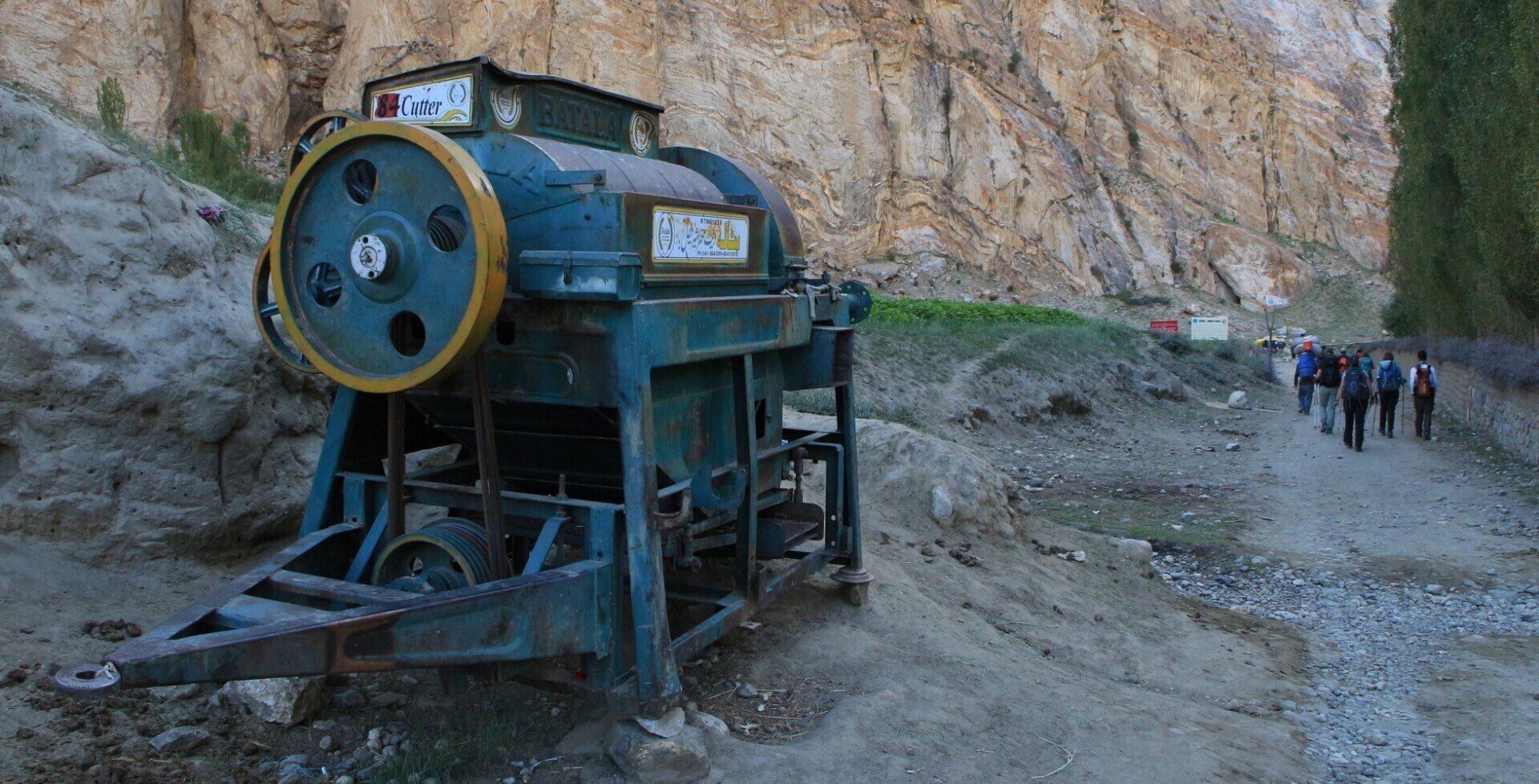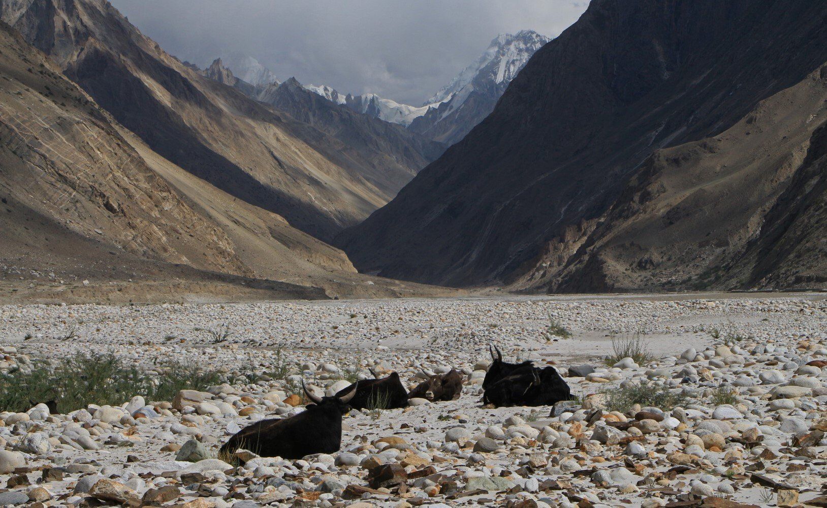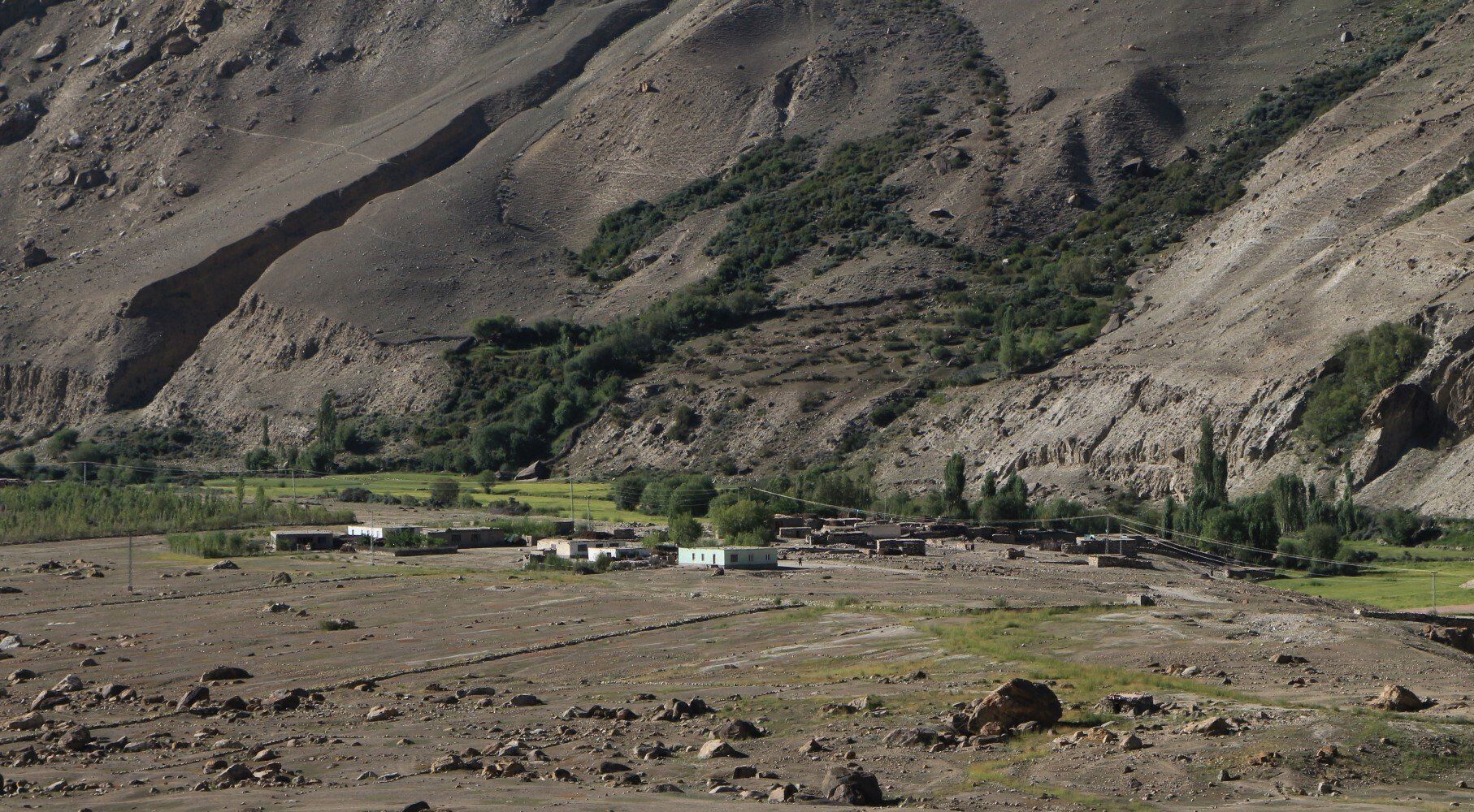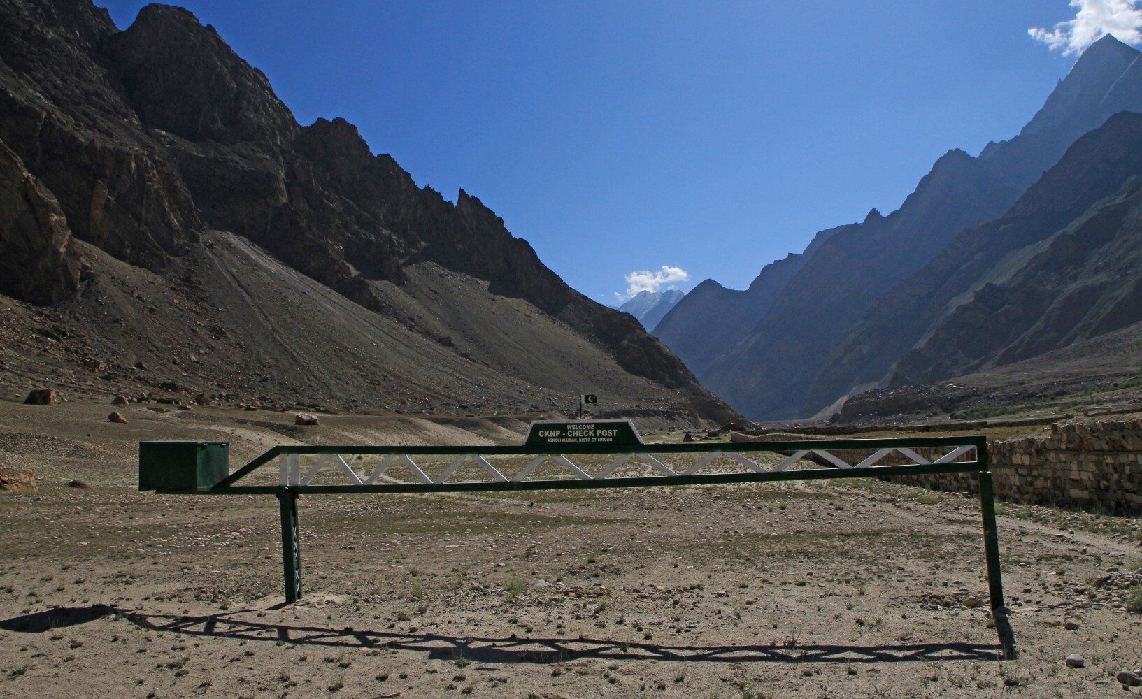 Het dal verbreed zich en verspreid over de vlakte liggen grote rotsblokken. Hier bevind zich ook een check point, een hek probeert nutteloos het pad door de vallei te blokkeren. Het is wel opvallend dat ik vanaf nu in Google Maps geen foto's meer kan uploaden, waarschijnlijk komt dit omdat we nu in het (militaire) grensgebied met India/Kashmir komen.