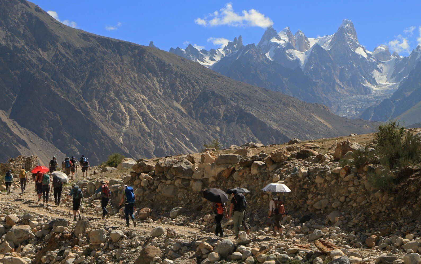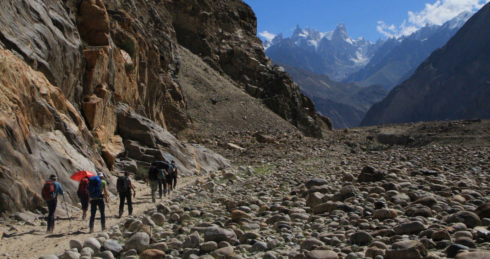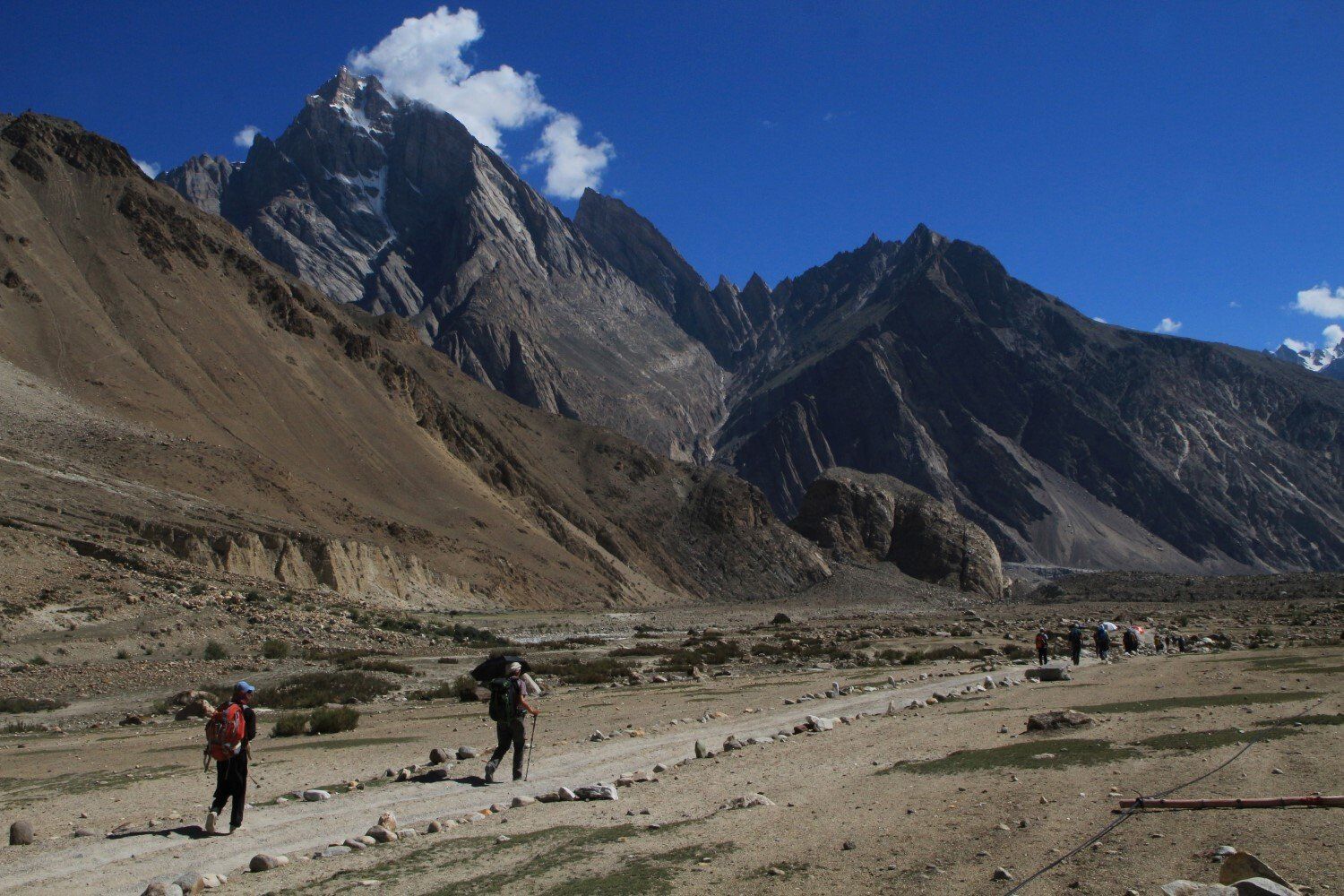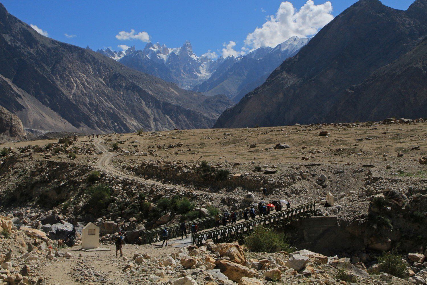 Het berglandschap is prachtig maar wel droog, ondanks dat we langs een woest stromende rivier lopen. Het is heel heet, maar er staat gelukkig wel een windje. Sommigen lopen met een paraplu voor tegen de zon. Een andere internationale groep loopt gelijk met ons op, maar zijn wel een stuk jonger en ook een stuk sneller. Links van ons ligt de Biafo Gletsjer, die zich 63 kilometer lang uitstrekt tot aan Snow Lake, waardoor dit de op twee na langste gletsjer ter wereld buiten de poolgebieden is. Vlak na een korte rust pauze, lopen we een hoek om en zien we dat het smeltwater van de Biafo Gletsjer een brug heeft weggeslagen. Eigenlijk helemaal niet gek als je ziet met welk geweld de rivier stroomt, je hoort de keien bonken in het water. Gelukkig hebben ze een kabelbaantje over het woest stromende water gespannen. Opvallend is dat ik thuis op de satelliet van Google Maps totaal geen rivier of zelfs een beekje kan vinden, terwijl we nu in gammel houten bakje 15 meter boven een 30 á 40 meter brede rivier hangen. De oude brug ligt verderop, hier zie je de gevolgen van de klimaatveranderingen en de overstromingen in Pakistan. We moeten achter aansluiten in de rij om te komen, en het duurt ruim een uur voordat iedereen in het bakje onder een staaldraad naar de overkant getrokken is. Heel spectaculair, helaas is het filmpje mislukt.