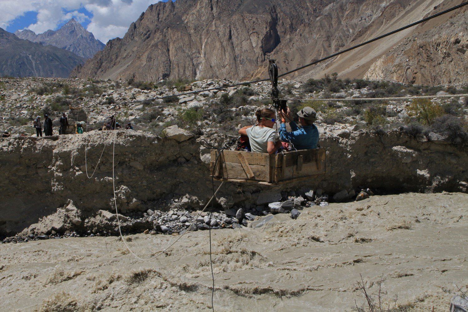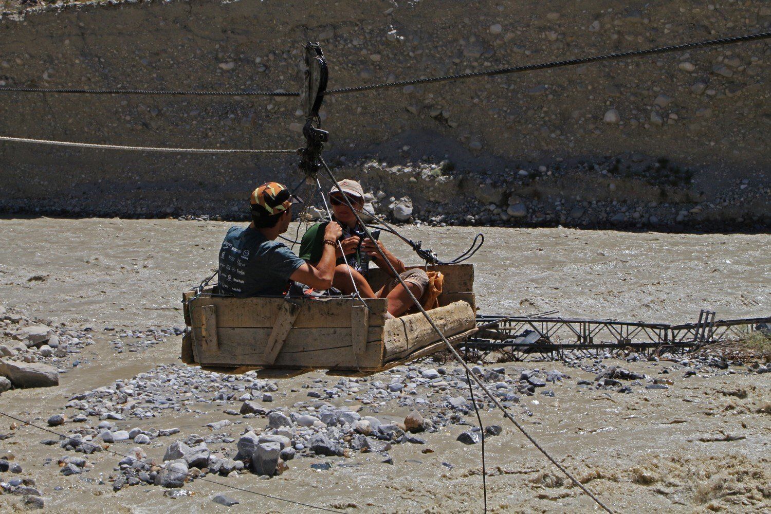 Gelukkig hebben ze een kabelbaantje over het woest stromende water gespannen.