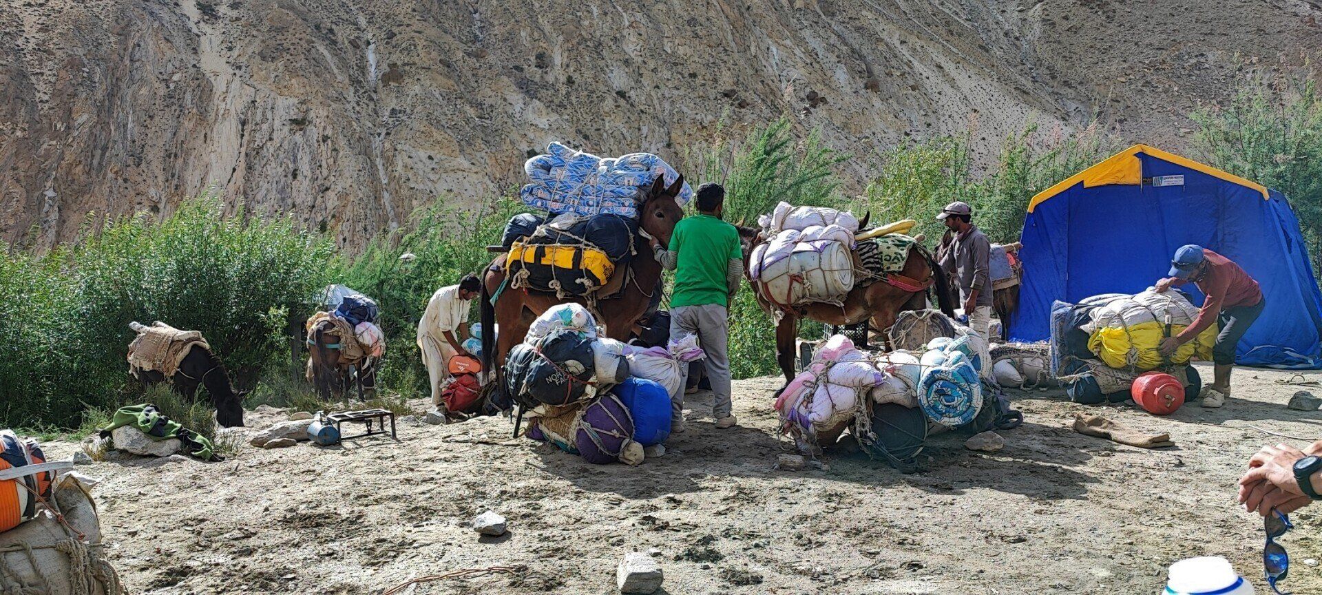 Uiteindelijk rond half 4 bereiken we ons kamp in Jhola (3140 m) en kunnen de muilezels worden afgeladen.